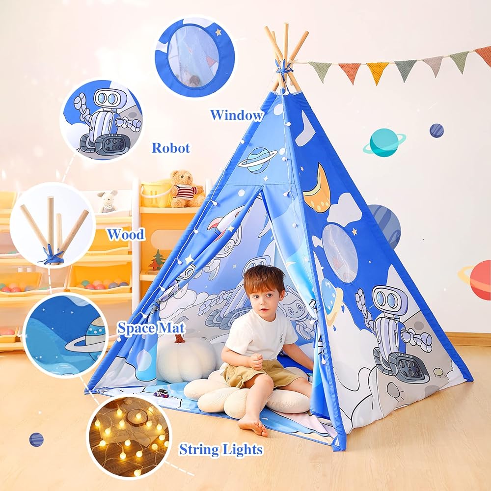 [Original Robot Teepee Design] - Kids love robots and space themes, this Teepee creates a sci-fi and cyberpunk universe for your kids. Our included string of lights will also light up the sky for little astronauts.