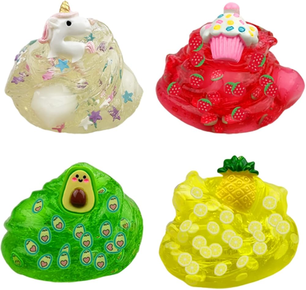 • 4 أنماط - السلايم الكريستالي بالداخل مع الأناناس الأصفر والفراولة الحمراء ووحيد القرن الأرجواني والأفوكادو الأخضر، تصميم لطيف ومضحك للعب