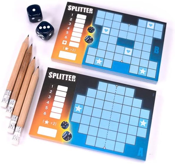 Splitter promises a whole new challenge with simple rules and a dash symmetry. In each round 2 dice are rolled, then everyone has to write the results on their page trying their best to group the same numbers together. The twist? The numbers must be entered symmetrically to the center axis! After 22 dice rolls everyone's pattern will be filled. Watch how different everyone's pages will look even though there were all working with the same roll results.