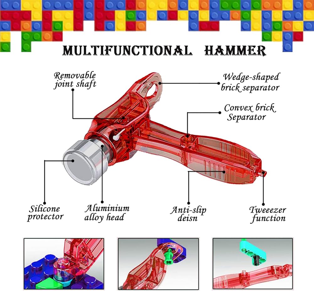 مطرقة متعددة الوظائف وكماشة الطوب: تحتوي كل من المطرقة والكماشات على واقيات من السيليكون بجوار الرأس، مما يحمي الطوب أو الكتل من أي ضرر محتمل. تتكون المطرقة من جزأين (يتم توصيلهما أو فصلهما بالمسمار المتقاطع) بوظائف مختلفة للمساعدة في تثبيت الكتل أو إزالتها. يمكن للكماشات فصل الطوب بأحجام أو أشكال مختلفة بسرعة