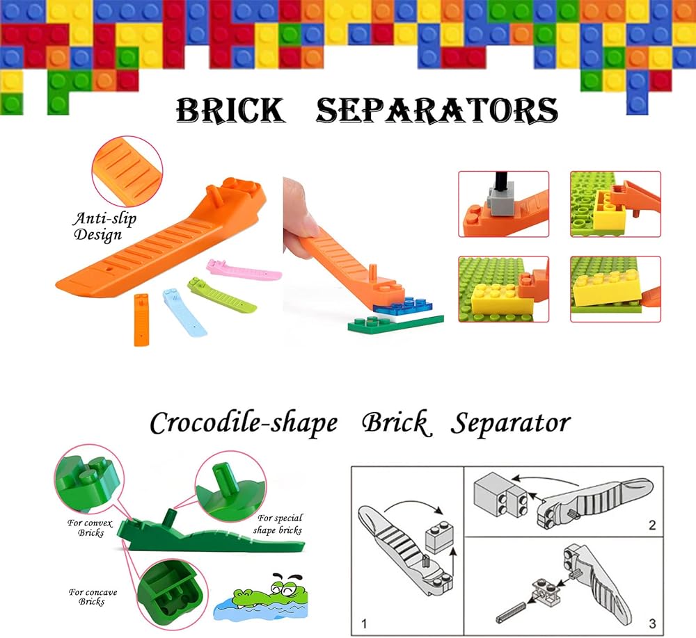 5 فواصل وملاقط: الملاقط ذات المقبض بطول مناسب ستساعدك على اختيار الأجزاء الصغيرة أو الطوب بسهولة لتجميع الطوب. توجد 5 فواصل من الطوب بألوان وأشكال مختلفة، ويمكن أن تعمل مع الكتل ذات الحجم العادي ويتم استخدام الفواصل الصغيرة خصيصًا لفصل الكتل الصغيرة عندما تحتاج إلى التفكيك.