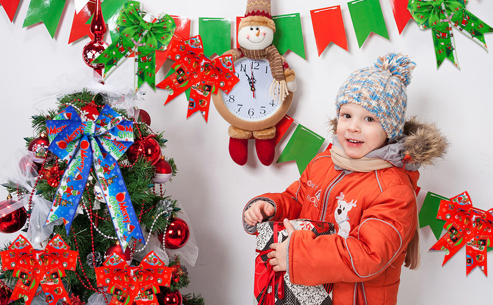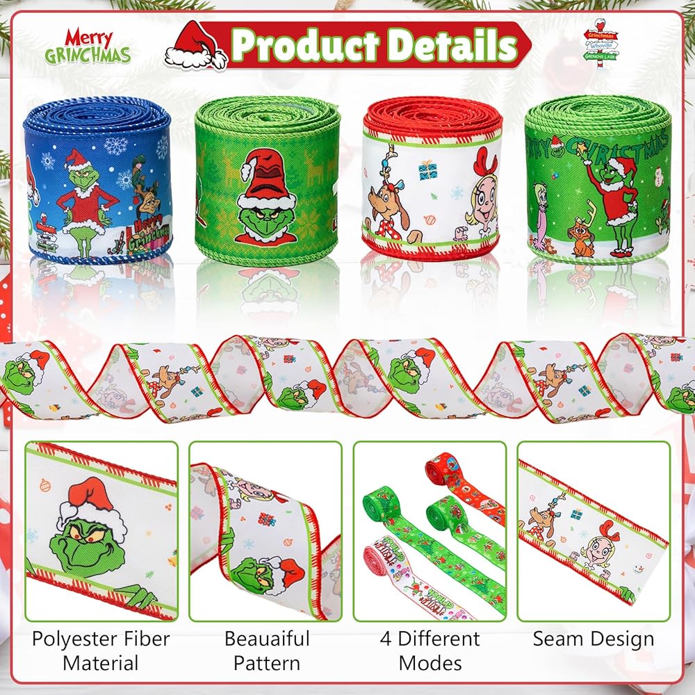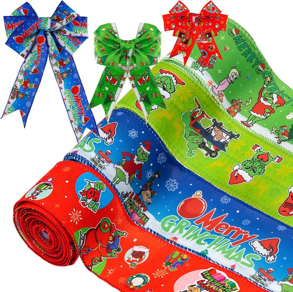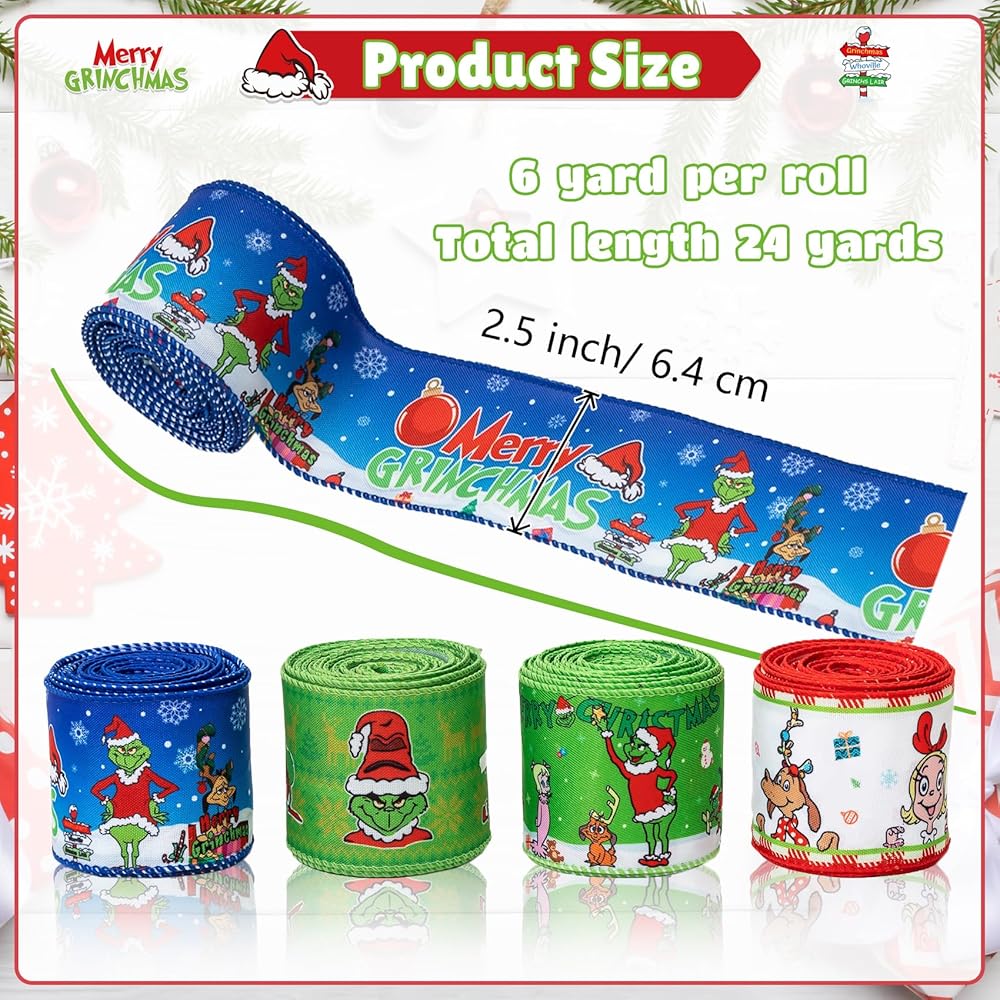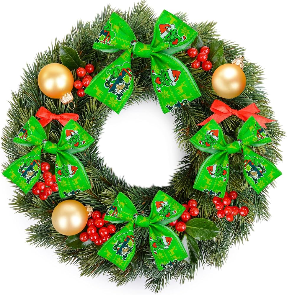 شريط سلكي غرينش محاصر، 2.5 بوصة، شريط عيد الميلاد مرتب بشكل جيد لأقواس اكاليل الزهور DIY والحرف اليدوية 30 ياردة