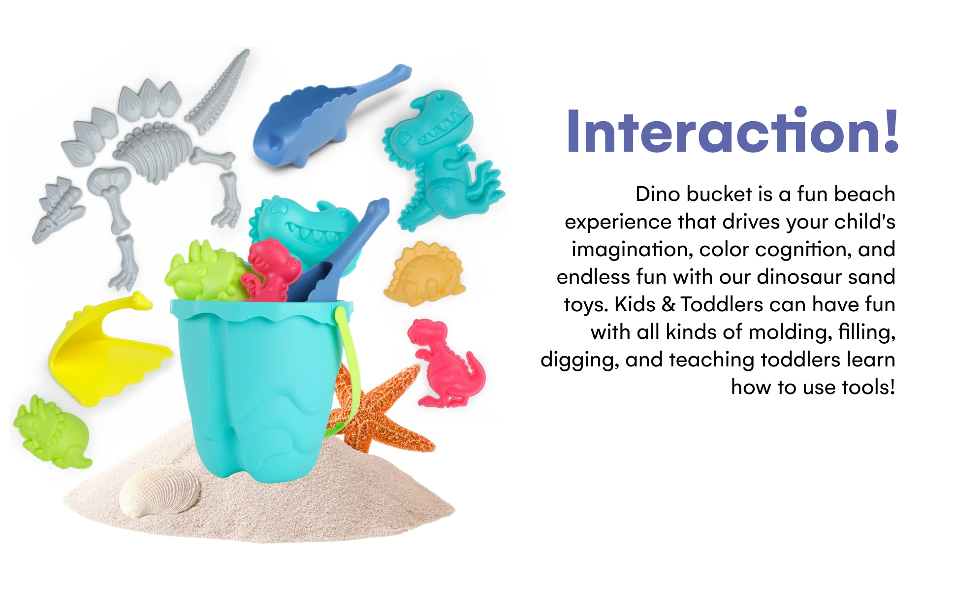 التفاعل: دلو دينو هو تجربة شاطئية ممتعة تثير خيال طفلك وإدراك الألوان ومتعة لا نهاية لها مع ألعاب رمل الديناصورات الخاصة بنا. يمكن للأطفال الصغار الاستمتاع بجميع أنواع القوالب والتعبئة والحفر وتعليم الأطفال الصغار كيفية استخدام الأدوات!