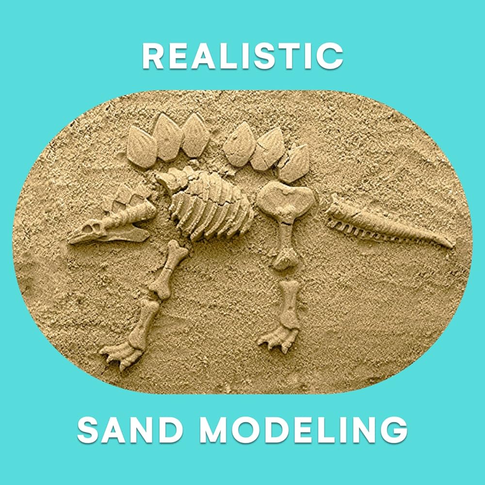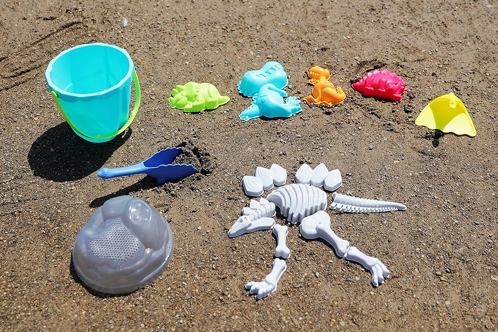 تشتمل على: ×1 لعبة الشاطئ على شكل دلو دينو مع حزام سهل الحمل وغطاء ×1 يمكن استخدامه كمنخل رمل، و1 مجداف رمل، و1 مغرفة رمل، و1 فيلوسيرابتور، و1 تي-ريكس، و1 ستيجوسورس، و1 ترايسيرابتور، و9 قوالب عظمة دينو.