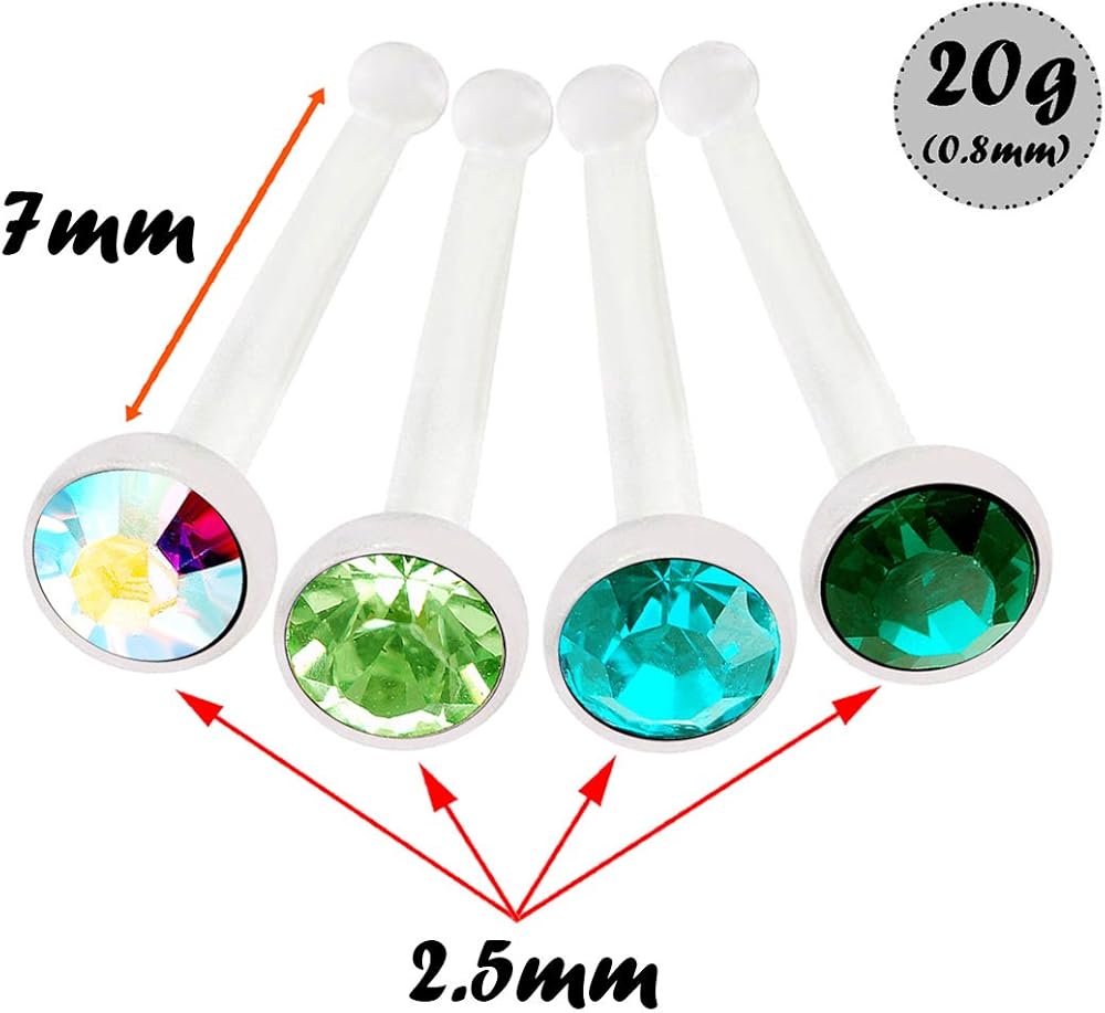 4 pieces of 20g (0.8mm) Flexible Acrylic nose bone, 20g (0.8mm), 2.5mm bezel set crystal. We have 6 color set for your choice, please choose the one you like.