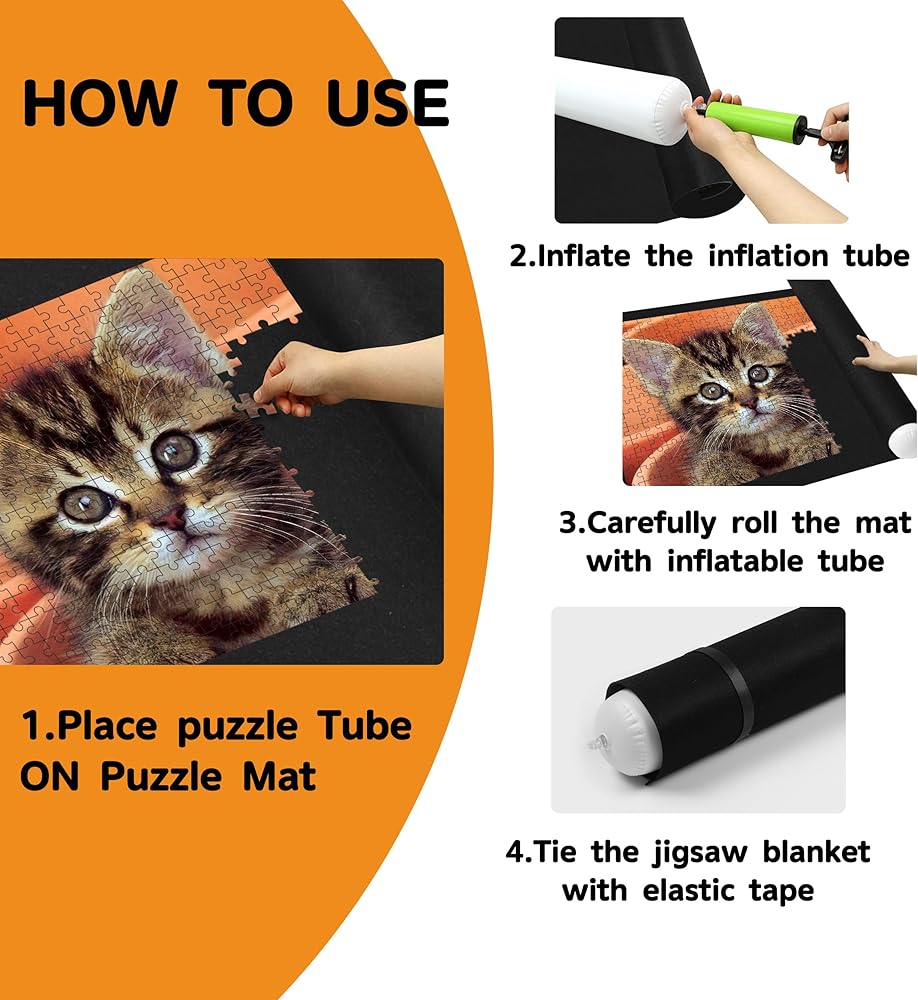 EASY TO USE: Using the puzzle mat saves time and effort and makes storing the puzzle easier and less stressful. Simply inflate the inflatable tube, place the inflatable tube on the end of the puzzle mat, roll it carefully, roll it up and secure it with elastic band.