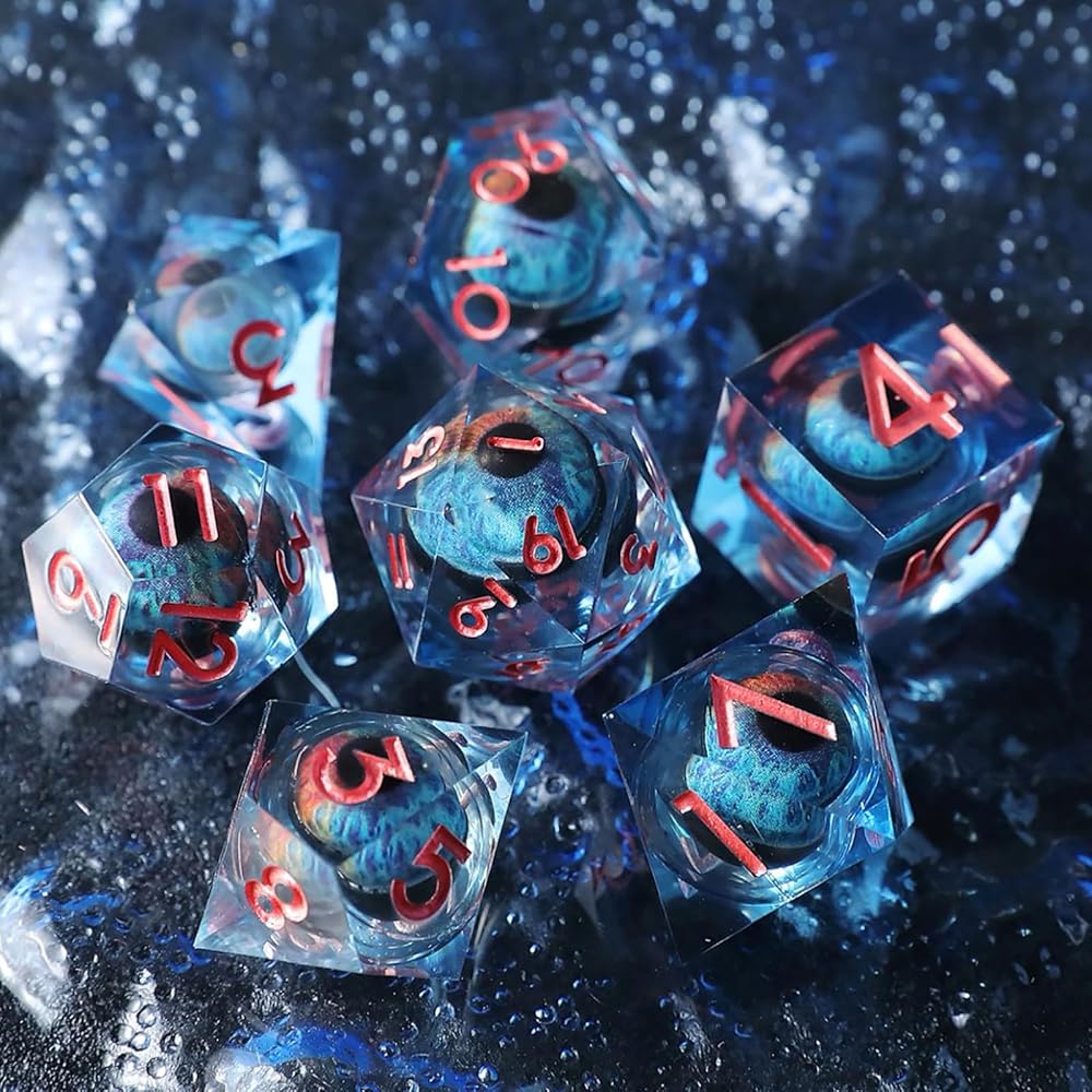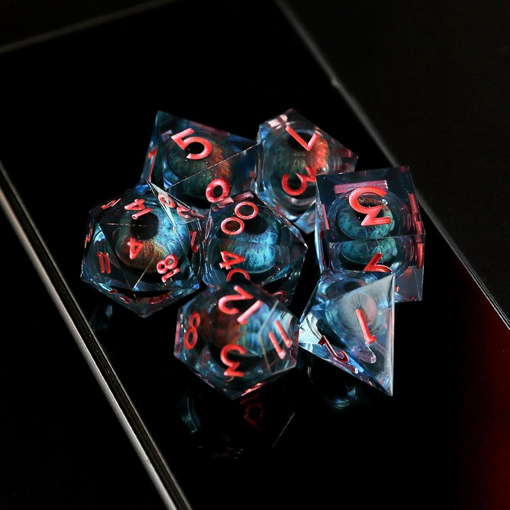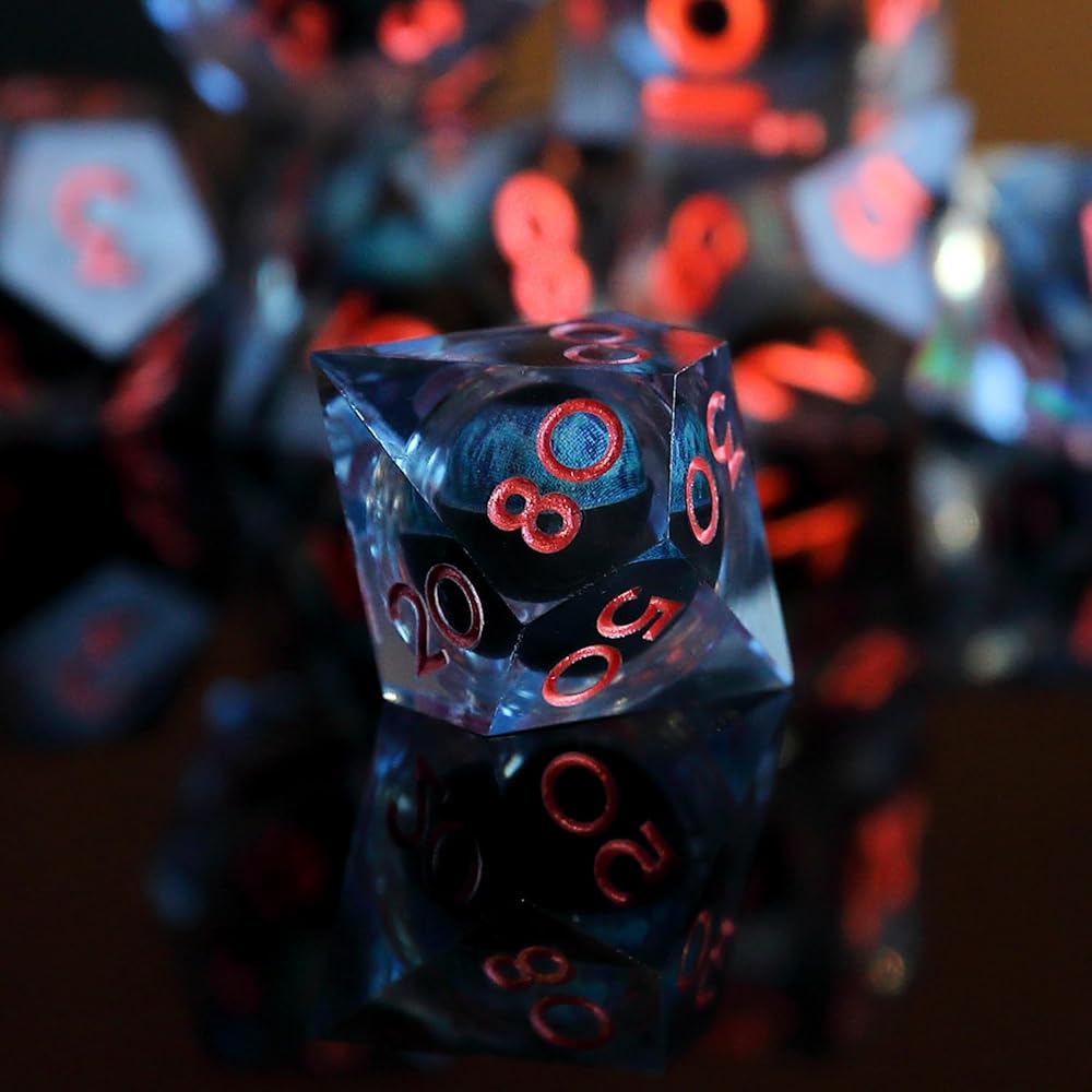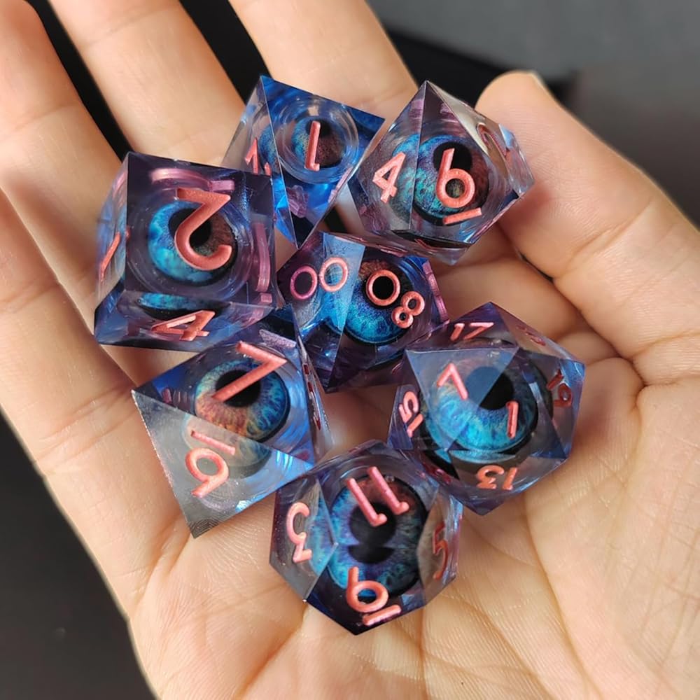 1.Dragon Eye Dice Set : The DND Dice has a dragon's eye and can be floating freely, the pupil magically finds a way to look up no matter how it lands or turns. In the game the eye of the devil will follow you, to unleash the full force of battle. One set dice total 7 pcs including D4, D6, D8, D10(0-9), D12, D20 and D%(00-90).
