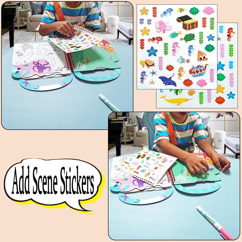 كتاب متعدد الوظائف 3 في 1: مجموعة كتب الطلاء بالماء، صفحة الملصقات والمشاهد، صفحة لعبة العثور على الاختلافات. لا تقلق بشأن كيفية تنظيف الحبر والبقع. يمكن للأطفال الاستمتاع بالتلوين وخلق التجارب.