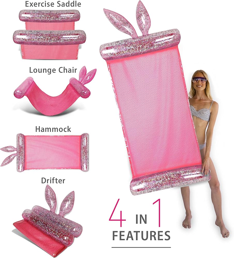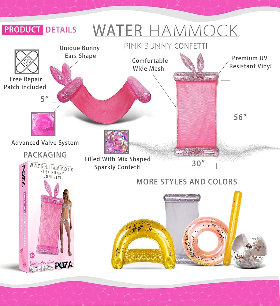 مرفق مع شراء أرجوحة مائية عائمة - تتضمن 1 بوزا أرجوحة مائية على شكل أرنب بينك محشوة بقصاصات ورقية لامعة بأشكال مختلطة ومصممة ببطانة شبكية عريضة مريحة للاستخدام متعدد الأغراض. استخدم مضخة الهواء الكهربائية مع نظام صمام الهواء السريع المتطور الخاص بنا لنفخ أو تفريغ الأرجوحة العائمة بسهولة. يبلغ مقاس الأرجوحة العائمة 56 × 30 × 5 انش وتأتي مع رقعة إصلاح في الصندوق. يوصى بها للأعمار من 6 سنوات فما فوق.