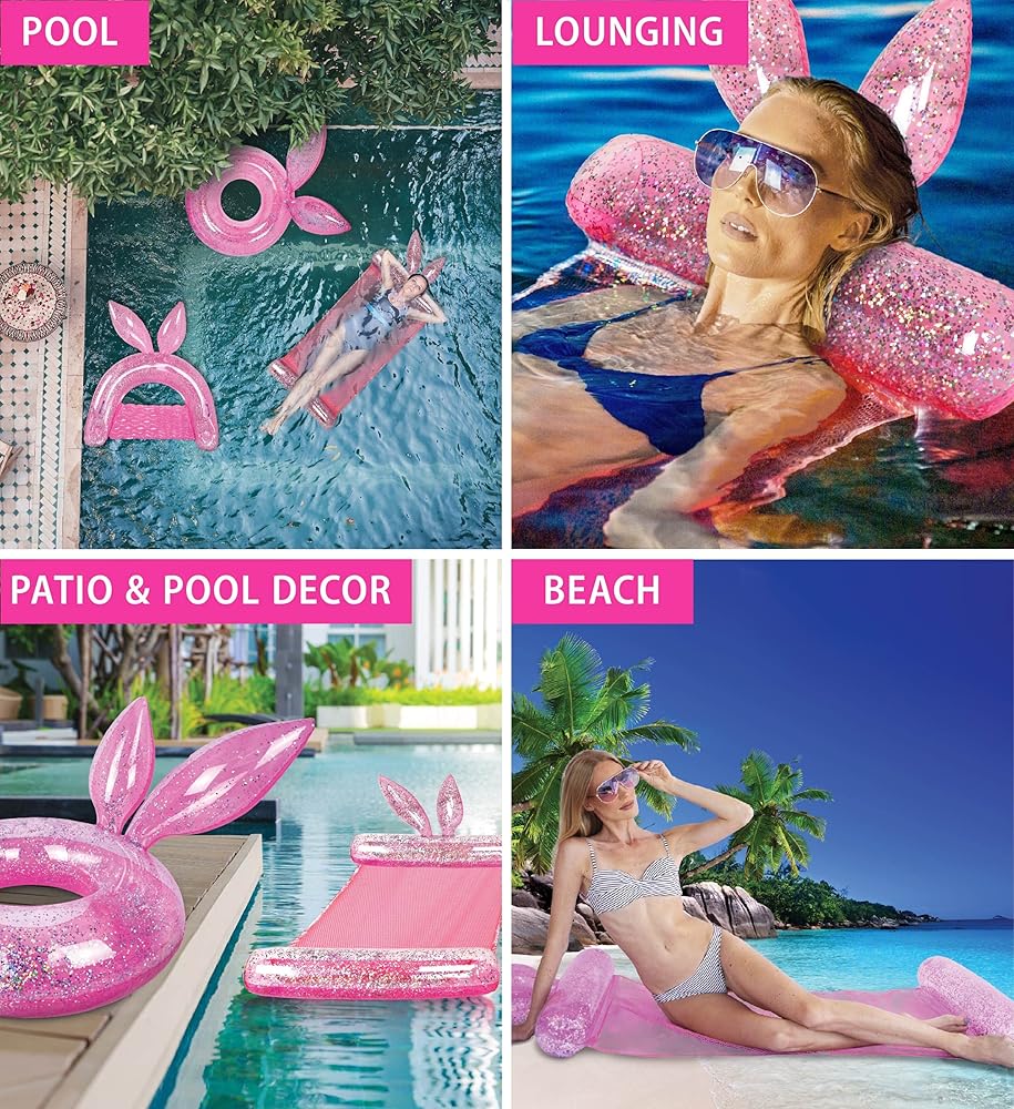 ملحقات حمام السباحة عالية الجودة - الأرجوحة العائمة القابلة للنفخ من بينك باني هي عوامة شديدة التحمل مصنوعة من مواد فينيل PVC عالية الجودة. مصنوعة من مقاومة للأشعة فوق البنفسجية ومقاومة للتمزق لحماية الأرجوحة القابلة للنفخ من بهتان اللون أو التشقق. مصممة بأذني أرنب جذابة وقصاصات فضية داخل الأنابيب. استخدم عوامة الأرجوحة المائية في العديد من المناسبات والأنشطة الخارجية الممتعة على الشاطئ أو حمام السباحة أو البحيرة.
