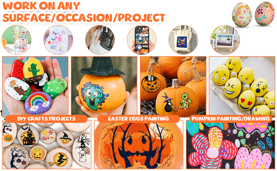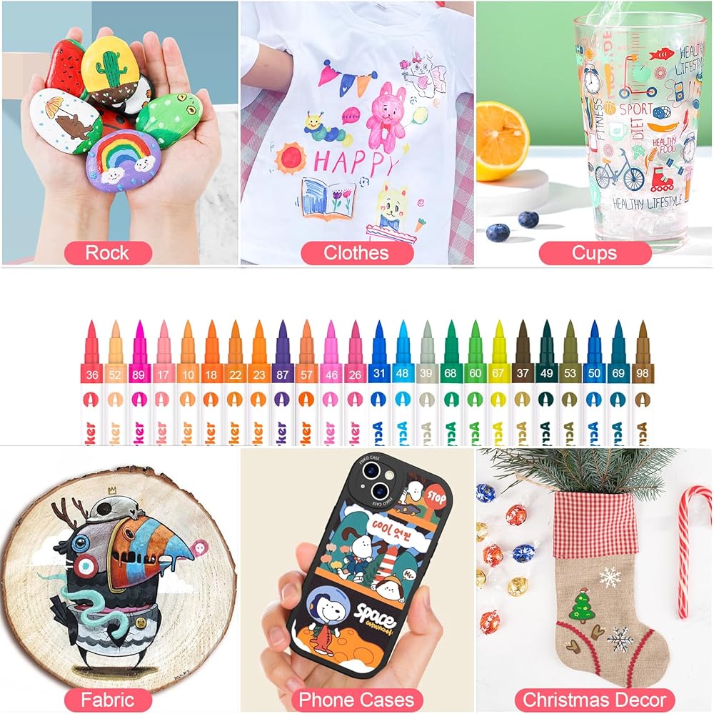 【تعمل بشكل جيد على أسطح متعددة】مجموعة أقلام الطلاء مناسبة لمجموعة متنوعة من الأسطح مثل الورق والملابس والبطاقات والمعادن والزجاج والصخور والخشب والبلاستيك والقماش والأقمشة والسيراميك وحافظات الهاتف والمزيد. ملاحظة: يرجى تشديد الغطاء ووضع أقلام طلاء الأكريليك أفقيًا إذا لم تستخدمها.