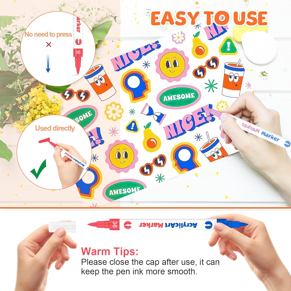 【أقلام طلاء أكريليك مزدوجة اللون】يتميز كل قلم أكريليك بطرف مزدوج، ولون مزدوج، وإبداع مزدوج، ورأس فرشاة مرن سيجلب المزيد من المرح لمشروعاتك الفنية. يمكنك إنشاء خط رفيع برأس فرشاة يبلغ 0.5-5 مم، ورسم خطوط دقيقة ومتوسطة وجريئة عن طريق تغيير ضغط الفرشاة.