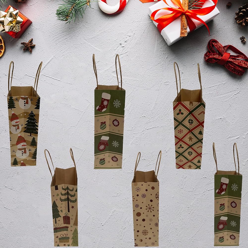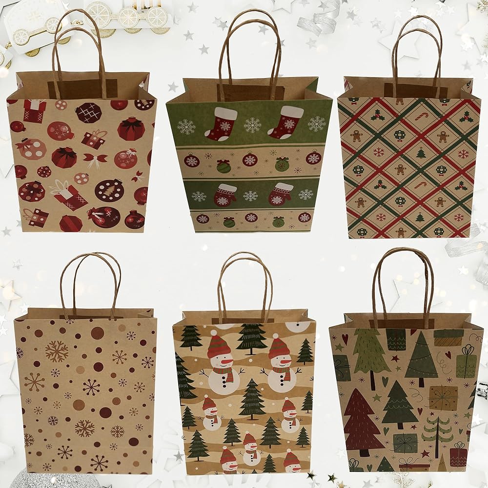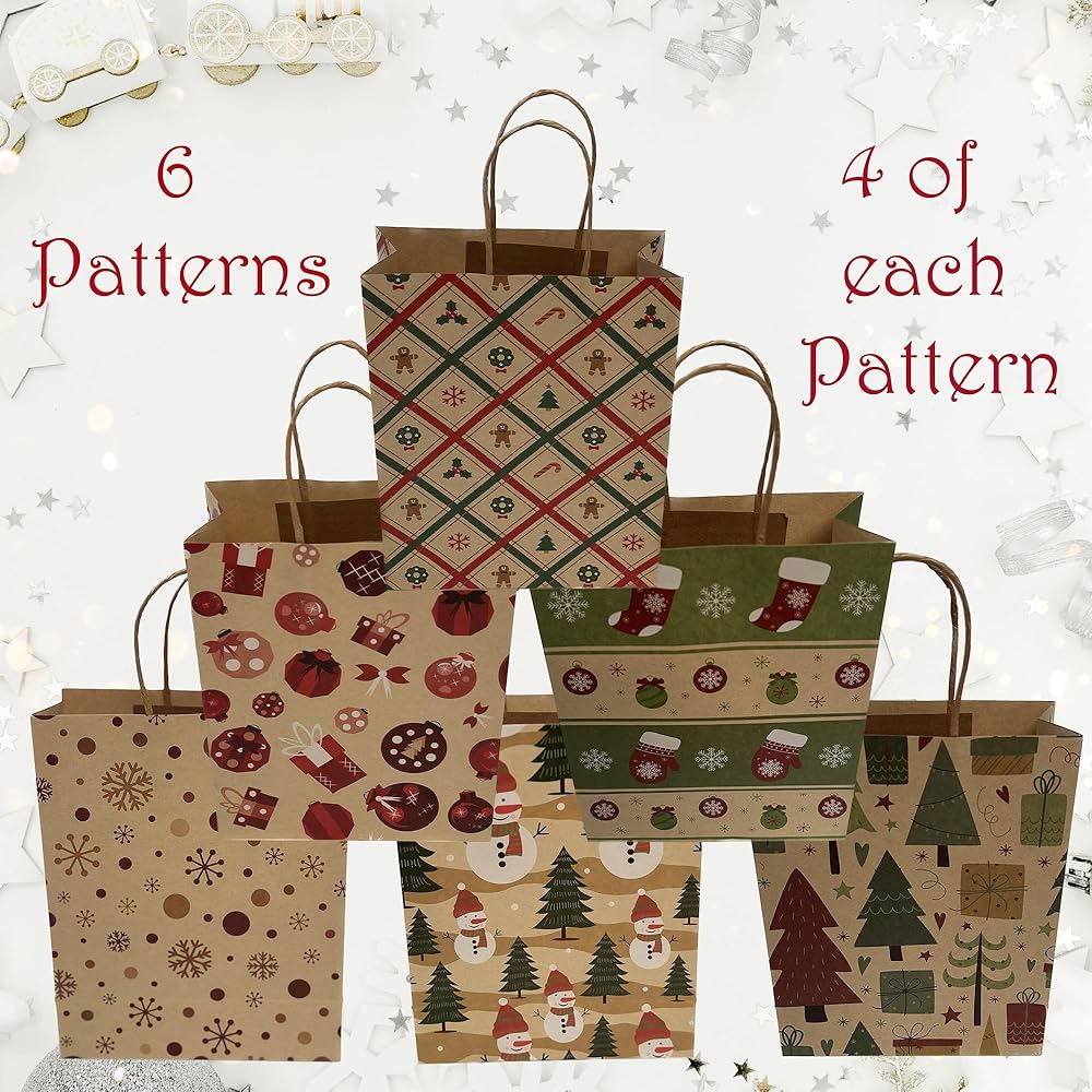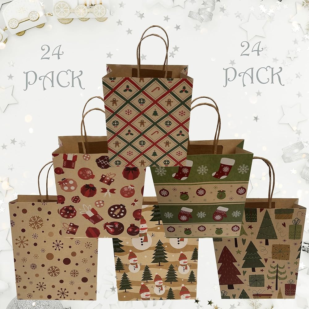اكياس هدايا الكريسماس من 24 قطعة، 7.5 انش × 9 انش × 3.5 انش، 6 انماط اكياس هدايا بالجملة مع مقابض، اكياس ورقية للكريسماس قابلة لاعادة الاستخدام واكياس هدايا، اكياس هدايا للعطلات