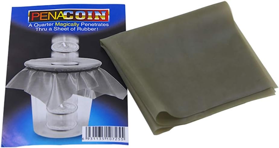 يظهر كوب الشرب مع الجزء العلوي مغطى بورقة مربعة من المطاط مثبتة بشريط مطاطي. يوجد ربع في الجزء العلوي من الورقة المطاطية. اجعل المتفرج يدفع لأسفل على الربع ومع البوب يخترق الربع مباشرة من خلال الورقة المطاطية. يمكن فحص كل شيء.