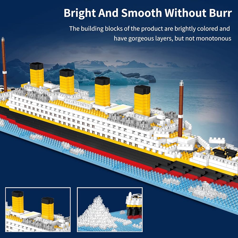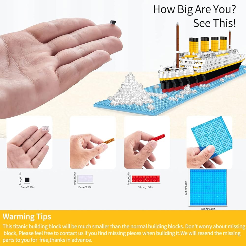 مشروع أكثر تحديًا، مجموعة مكعبات تايتانيك الصغيرة هذه هي تجربة بناء فائقة مع تحدي وتطور أكبر من أي مجموعة بناء أخرى. ملاحظة: ستكون مكعبات البناء أصغر بكثير من مكعبات البناء العادية. يرجى قراءة المقاس بعناية قبل اتخاذ القرارات.