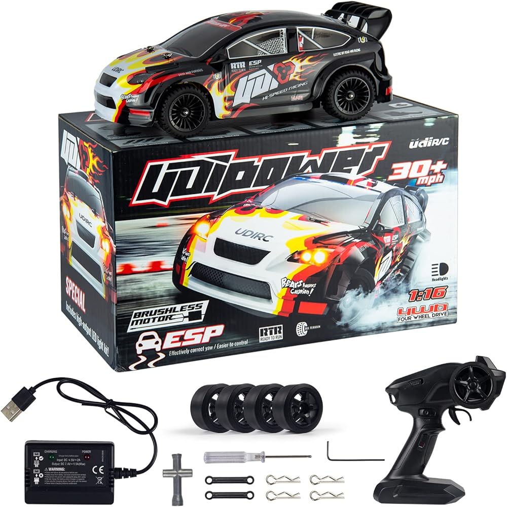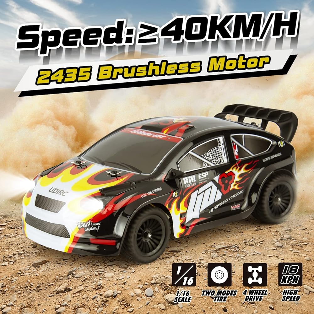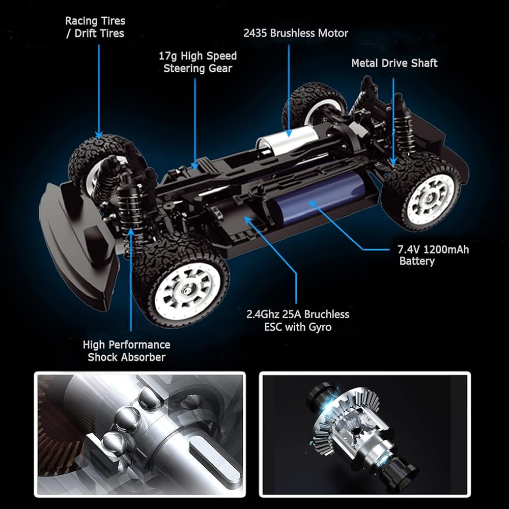 【Powerful 2435 Brushless Motor】4WD Four-Wheel Drive System, equiped with 2435 Brushless motor(3900KV), 2.4Ghz 25A Bruchless ESC and high-speed steering gear, providing a maximum traction on all terrains like desert, rock, grass, sand or concrete road, offers excellent off-road performance on drift and racing.