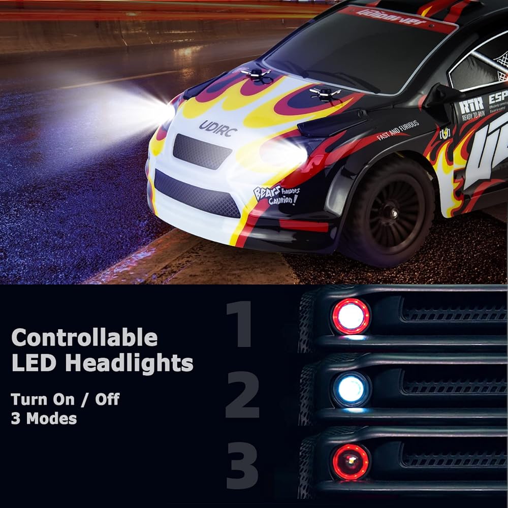 【Replacable Drift / Racing Wheels】Equiped with extra Drift Wheels, you can change the original racing wheels to enjoy the excitement for drift. This rc truck also featues LED headlights with 3 lighting modes.