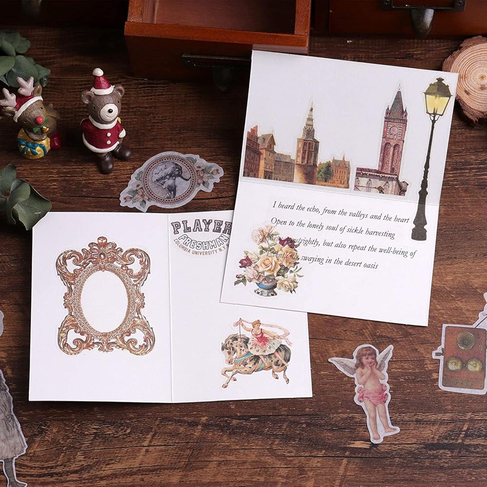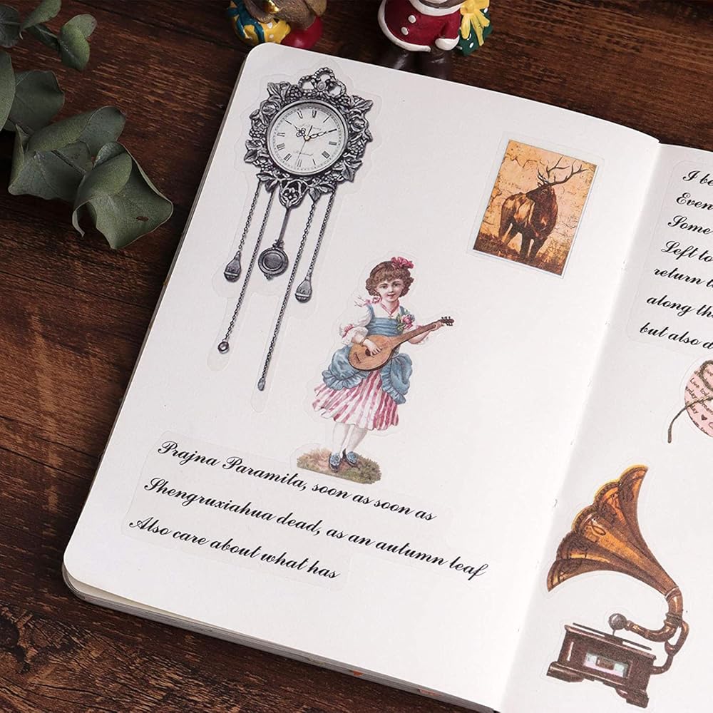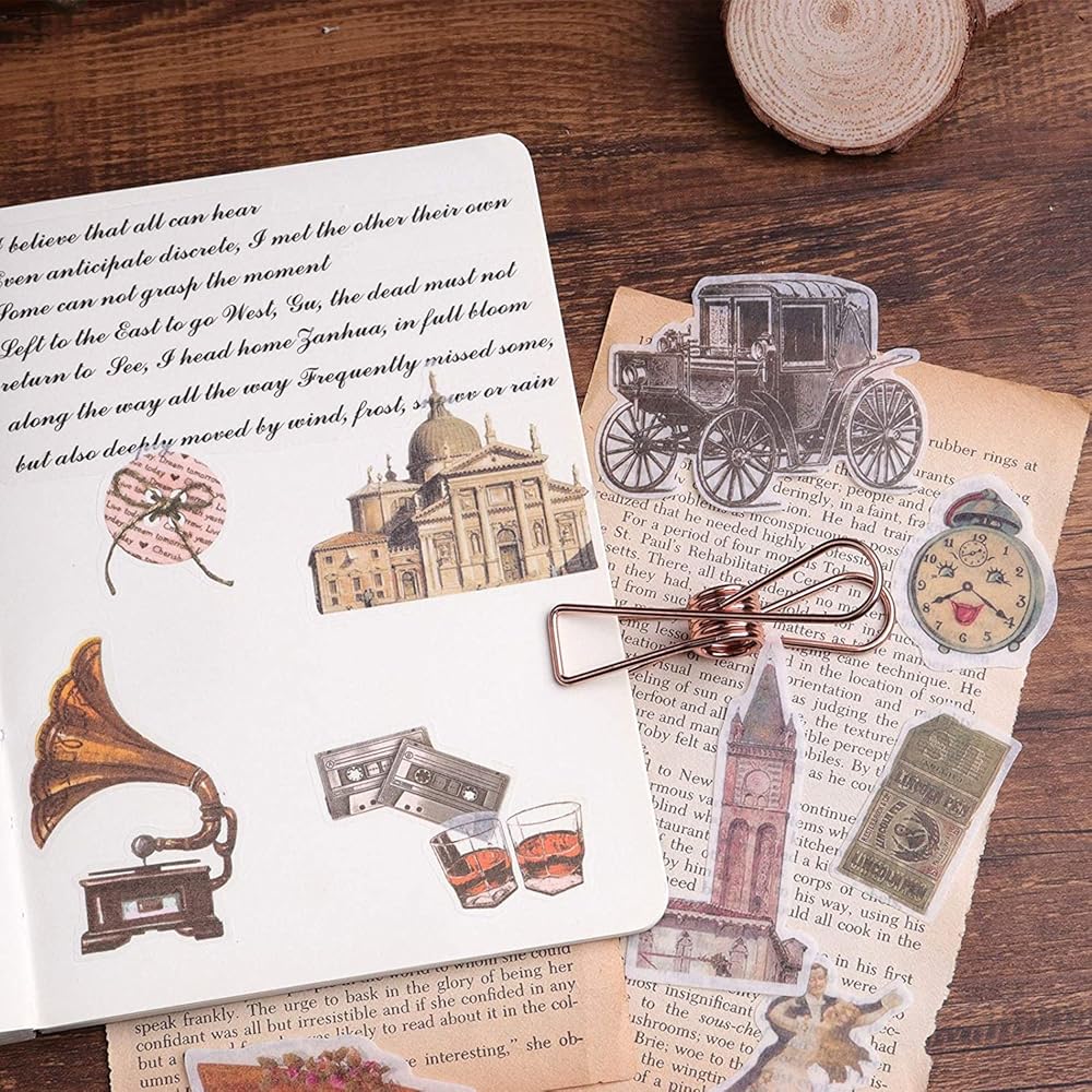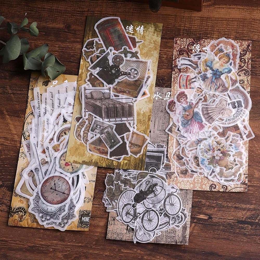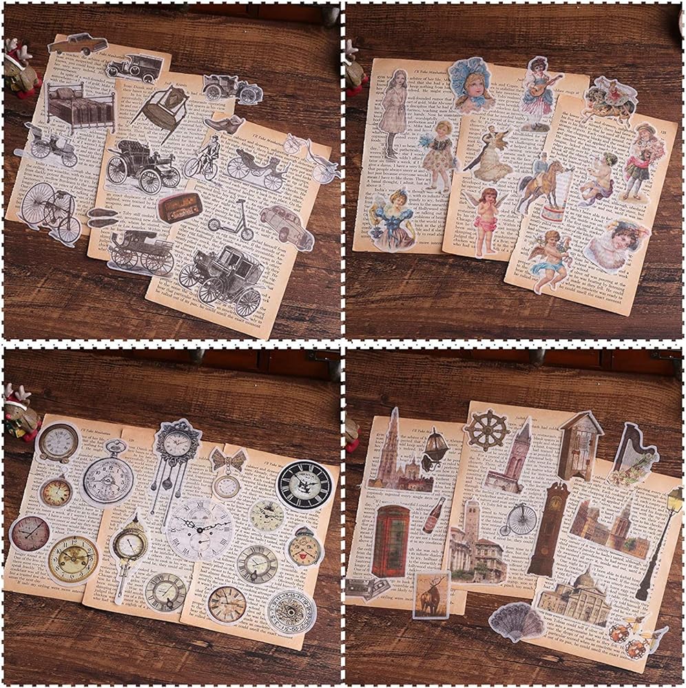 4. VINTAGE EPHEMERA SUPPLIES: Our journaling decorative stickers are individually packaged in sets - clock faces, vintage items, old transportation, lovely Victorian stickers, the colors are muted, best to use on paper that is either white or light colored.