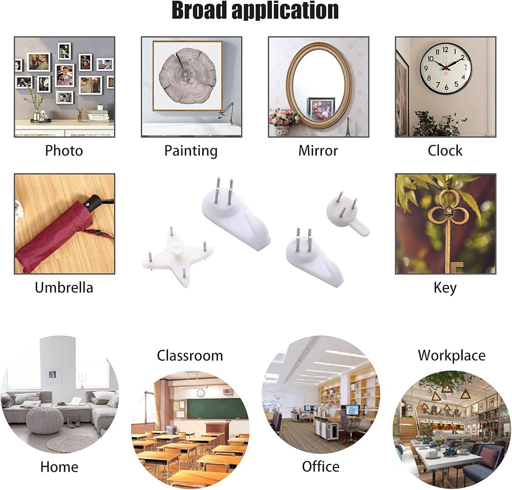 【استخدام واسع】تستخدم مجموعة شماعات الصور غير المرئية شودولي على نطاق واسع لتعليق العديد من الديكورات الفنية أو المنتجات، مثل الصورة/اللوحة/الإطار/المرآة/الساعة/زينة المتابعة/المظلة/المفتاح/الحقيبة/الملابس/قلادة صغيرة/السبورة السوداء؛ مناسبة للأسطح المتنوعة، مثل الطوب/الخرسانة/الأسمنت/الجير/الجص/الجص/كتلة السمراء/المكعبة/ورق الحائط الأبيض والخشب الباب؛ فمن البوب. يستخدم بشكل خاص في المنزل والمكتب والفصول الدراسية ومكان العمل وغرفة الإيجار؛ ملاحظة: غير مناسب للزجاج وبلاط السيراميك والجدران الحجرية والجدران الحاملة.