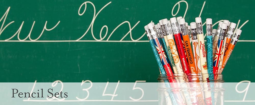 - 10 pencils (5 per design) and a sharpener packaged in a tin