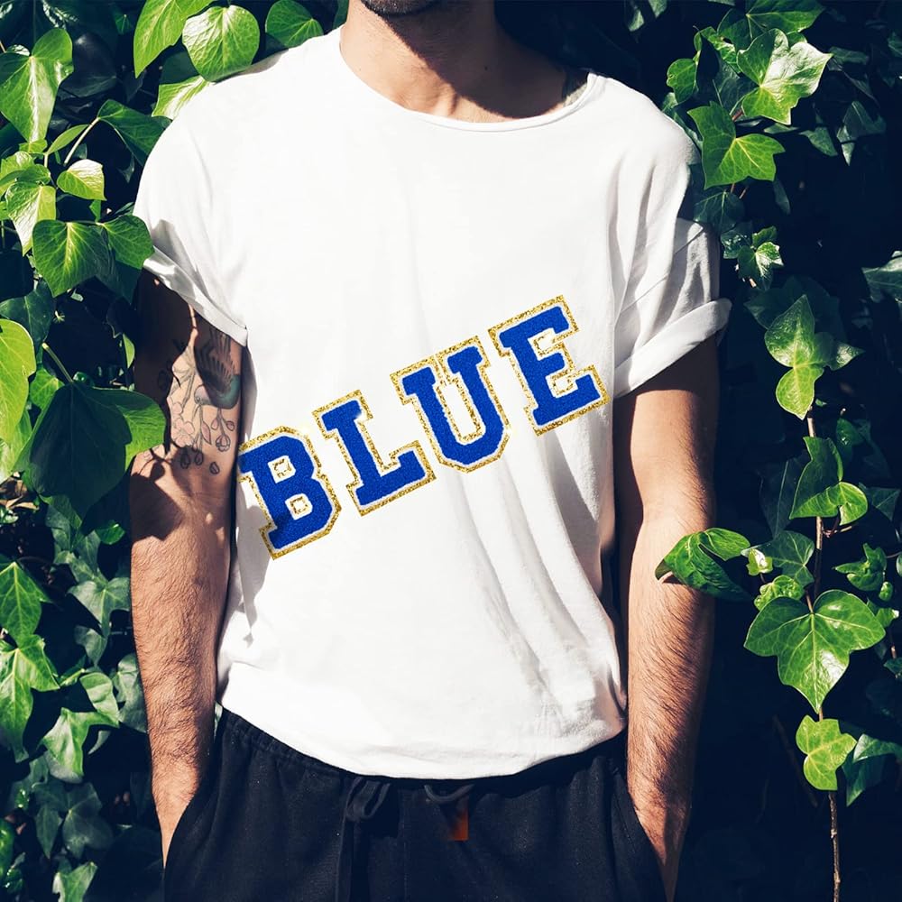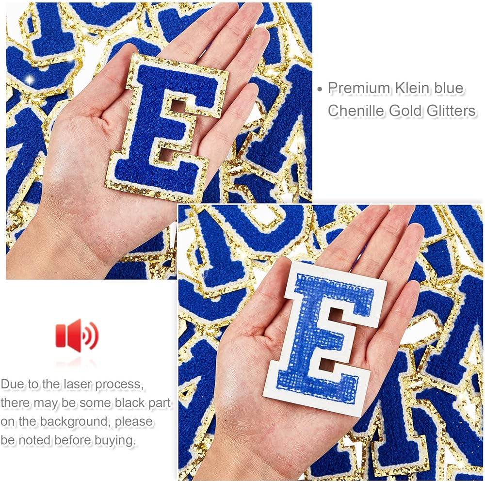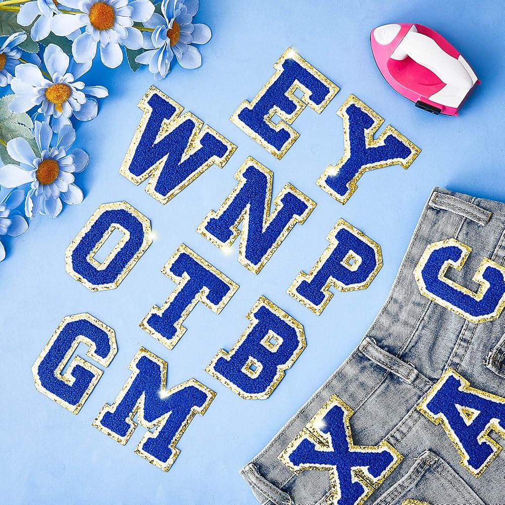 26 Pieces Chenille Letter Patches Iron On Letters Patch Letter Patches Glitter Chenille Patches A-Z Patch Embroidered Patch Gold Border Sew On Patches for Clothing Hat Shirt Bag (Blue, White)