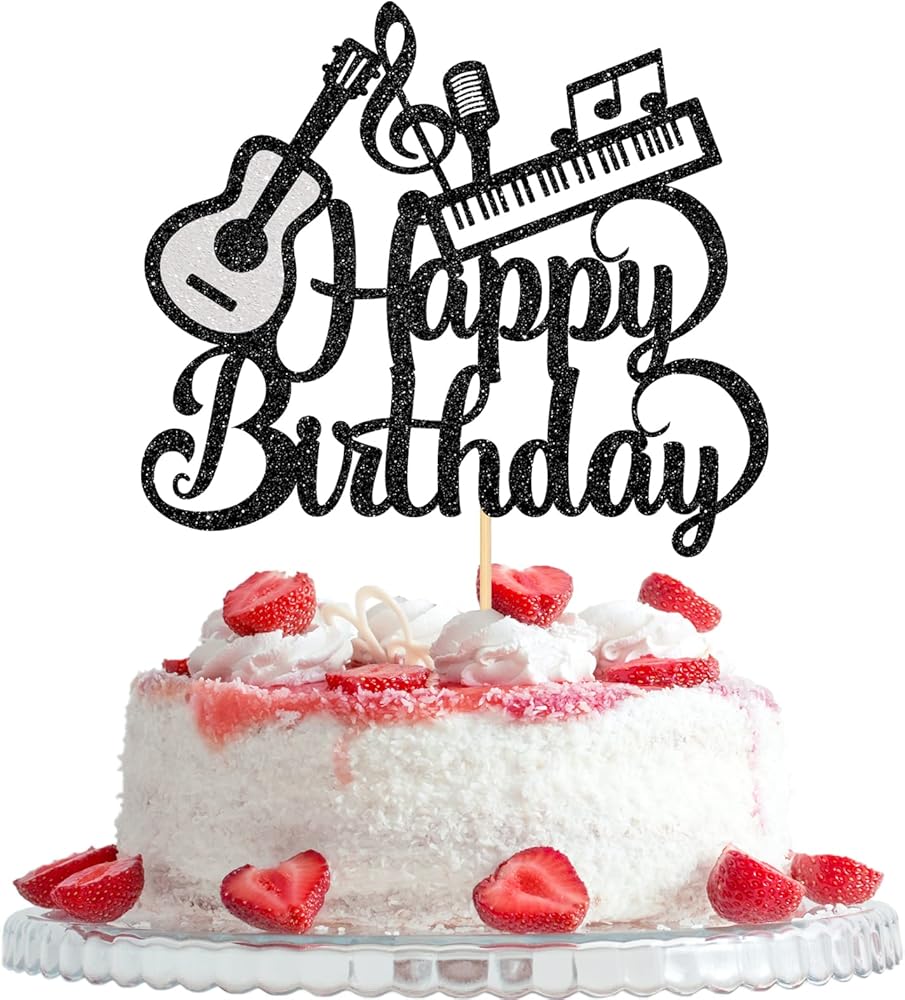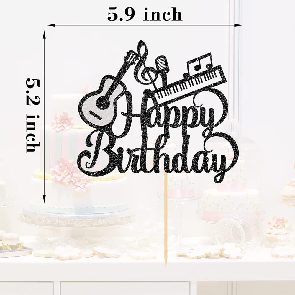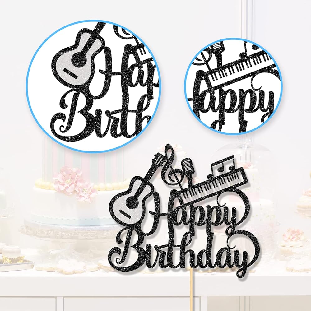 موسيقى الجيتار البيانو عيد ميلاد سعيد كعكة توبر، عاشق الموسيقى موضوع حفلة عيد ميلاد اللوازم، عيد ميلاد سعيد علامة كعكة الزينة لمشغل النوتات الموسيقية البيانو الغيتار، بريق أسود