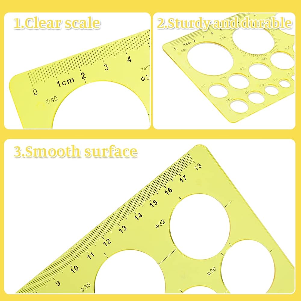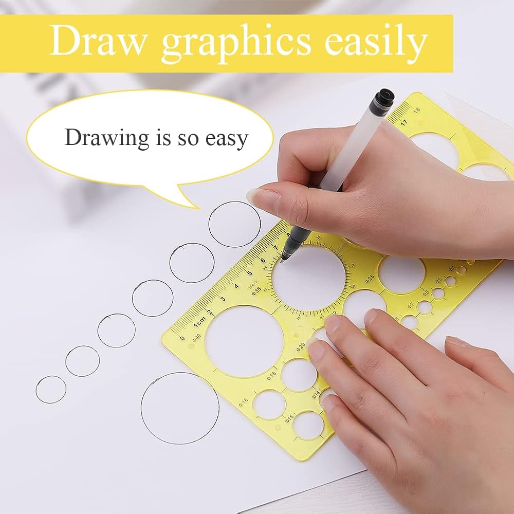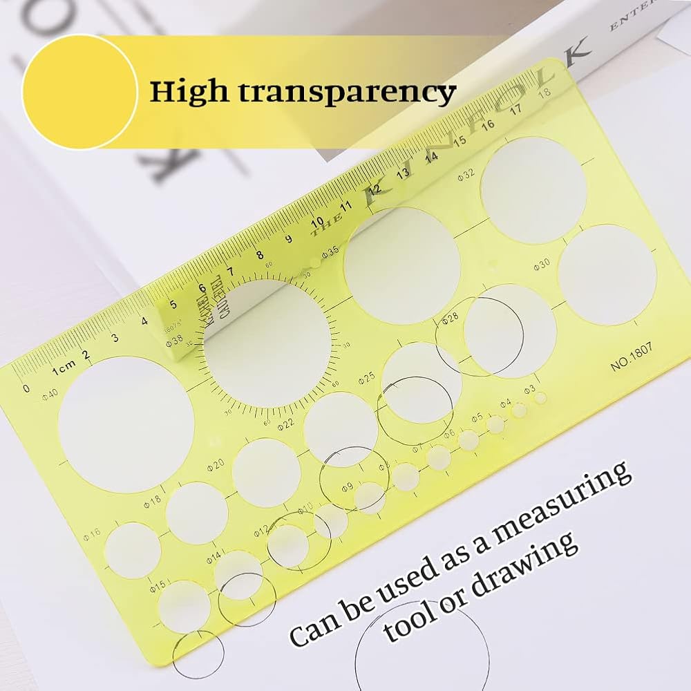 متعددة الوظائف: قوالب رسم دائرية بأقطار مختلفة، مما يجعل رسم الدائرة أكثر ملاءمة ودقة، وفتحات دائرية بأحجام مختلفة لتحفيز الأفكار المختلفة. يغطي التصميم المعماري، والرسم المنزلي، والرسومات الهندسية، وتصميم الملابس، ولف الورق DIY، ومسطرة التعلم والمساطر الأخرى.