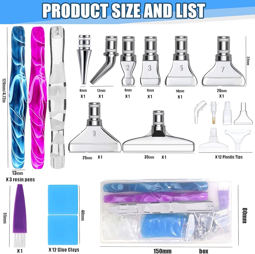 • مجموعات أقلام الرسم الماسي التي يجب اقتناؤها: صندوق يحتوي على 3 أقلام رسم ماسية أنيقة بحجم مناسب، و8 رؤوس طلاء ماسية مصنوعة من الفولاذ المقاوم للصدأ و12 قطعة من الطين. إذا كانت أطراف الطلاء الفولاذية ثقيلة جدًا، فيرجى التوجه إلى رؤوس الأقلام البلاستيكية الـ 12. ستكون مجموعات أقلام الرسم الماسي هذه بصحبتك لإنشاء أعمال رسم ماسية جميلة.