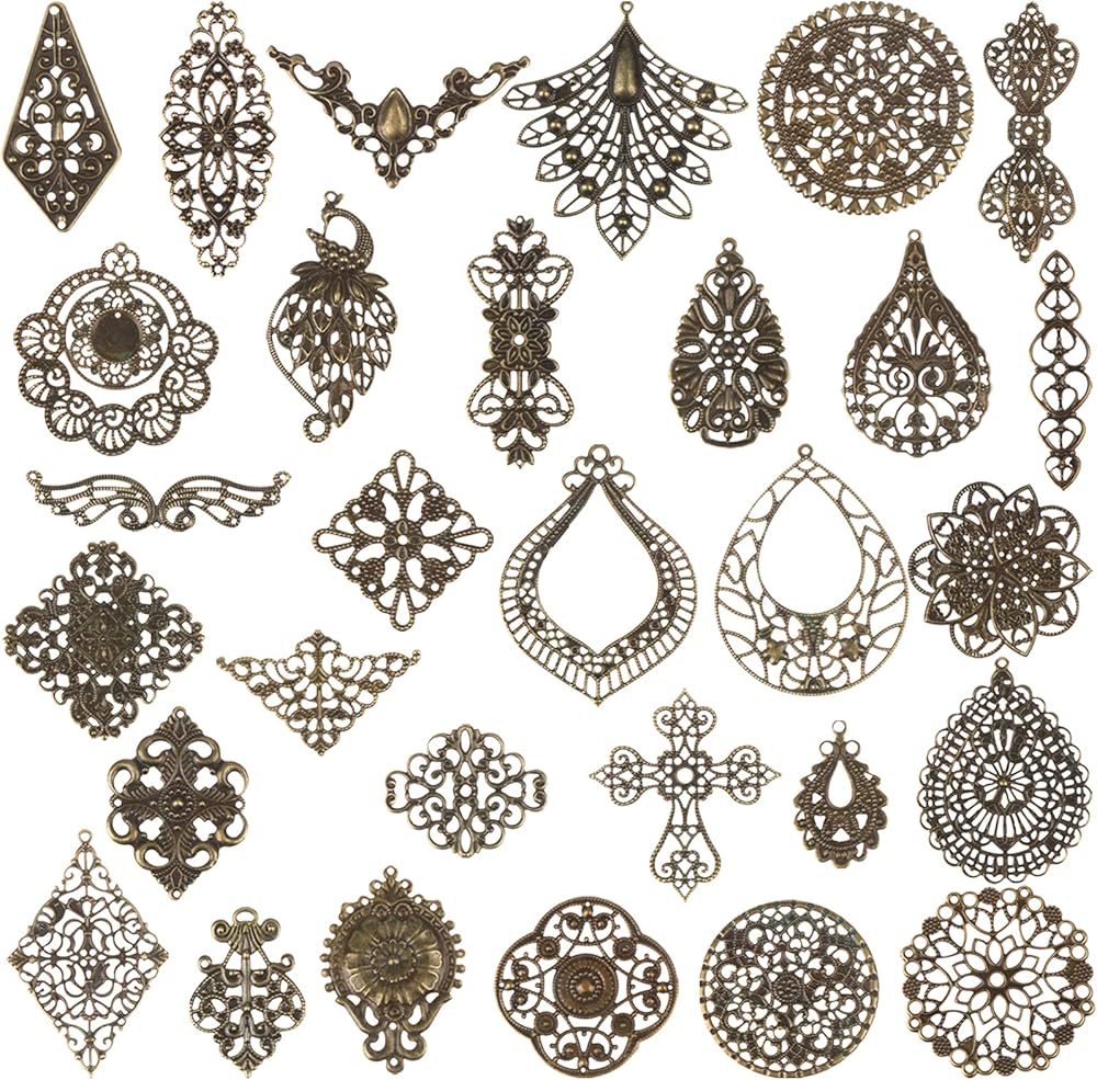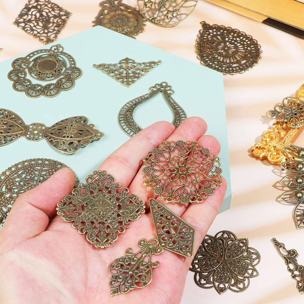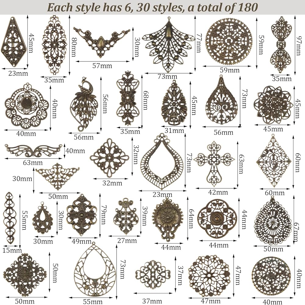 المقاس - تأتي بمقاسات مختلفة، 15-73 × 30-97 ملم، الفتحات: 1-3 ملم. ولكن لا شيء كبير جدًا. يرجى الاطلاع على وصف المنتج للحصول على تفاصيل المقاس. ستكون رائعة لسجل القصاصات/الحرف اليدوية أو صنع المجوهرات أو استخدامها على الملابس. توجد فتحات صغيرة في العديد من القطع، مما يجعل من السهل ربطها بالمجوهرات.