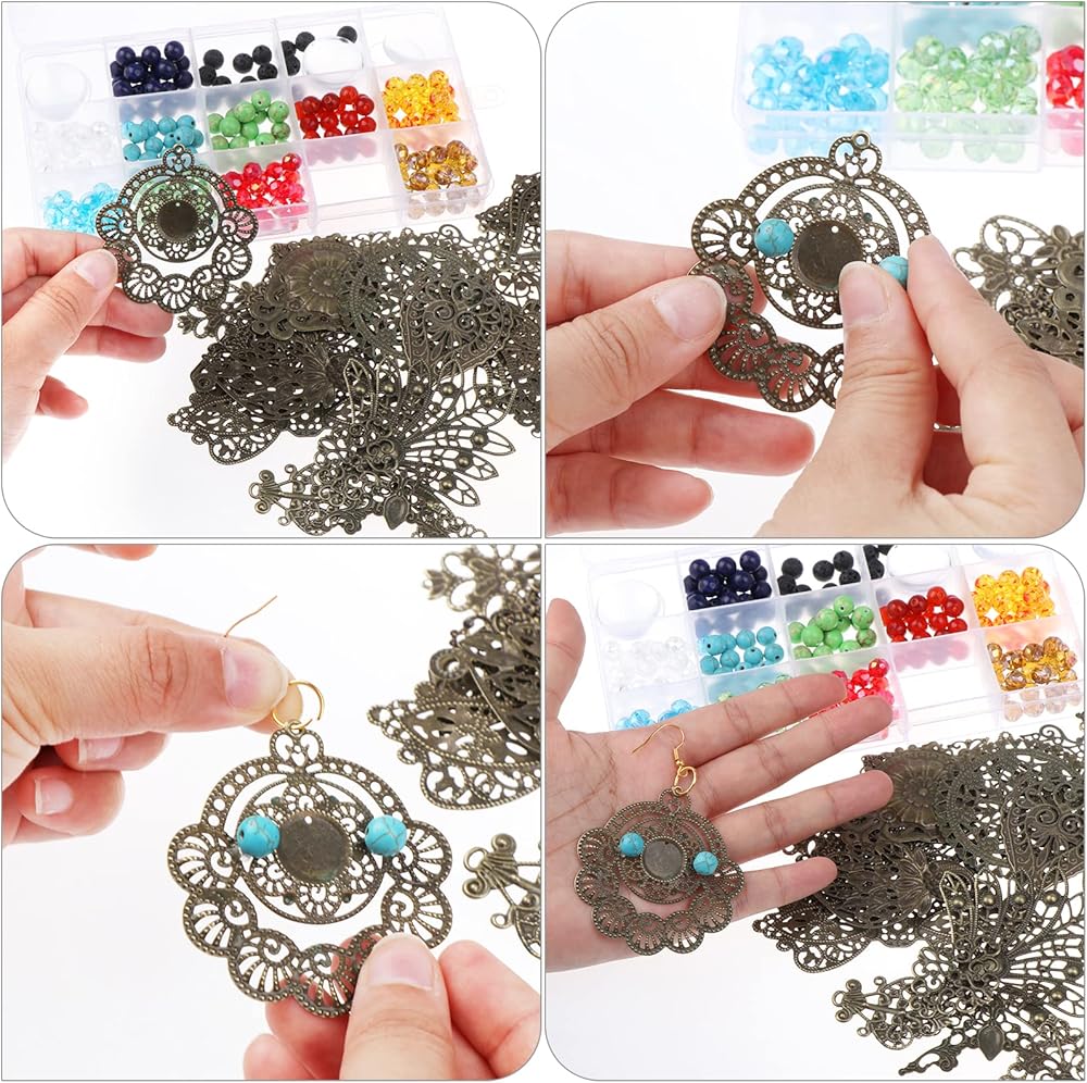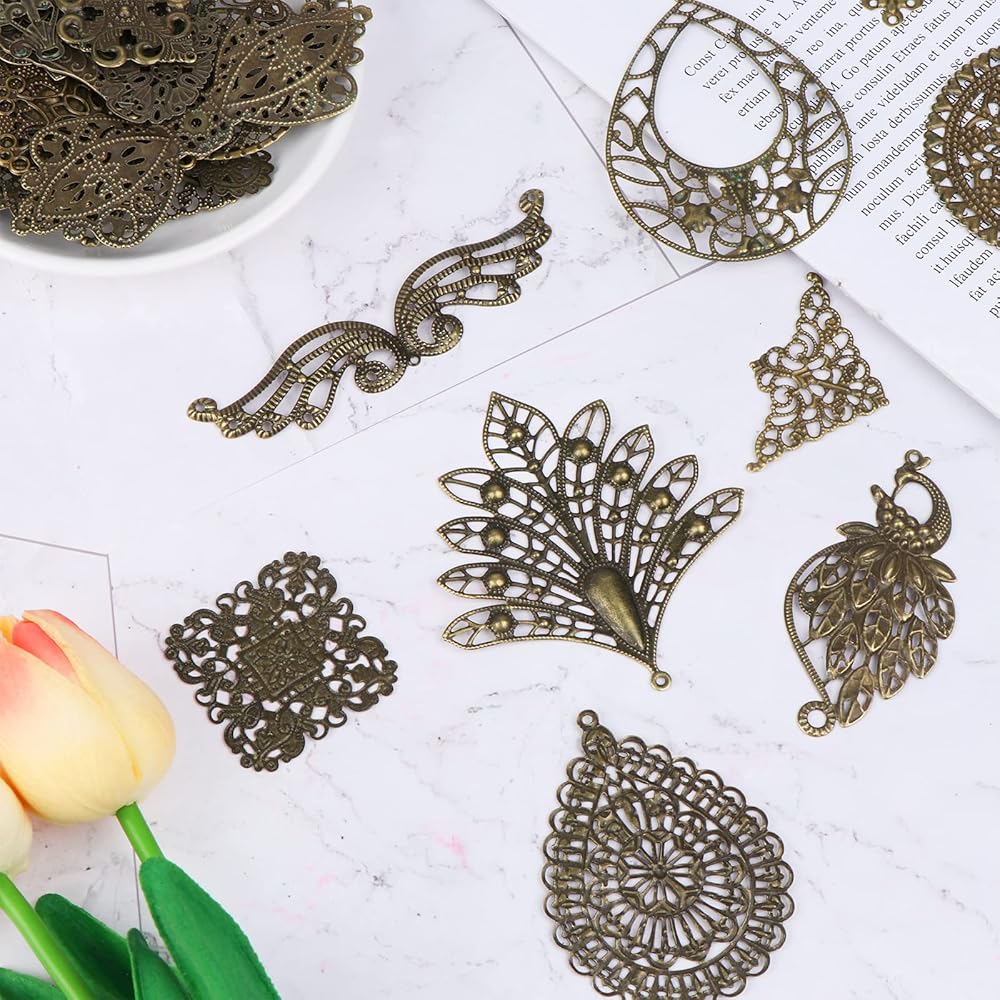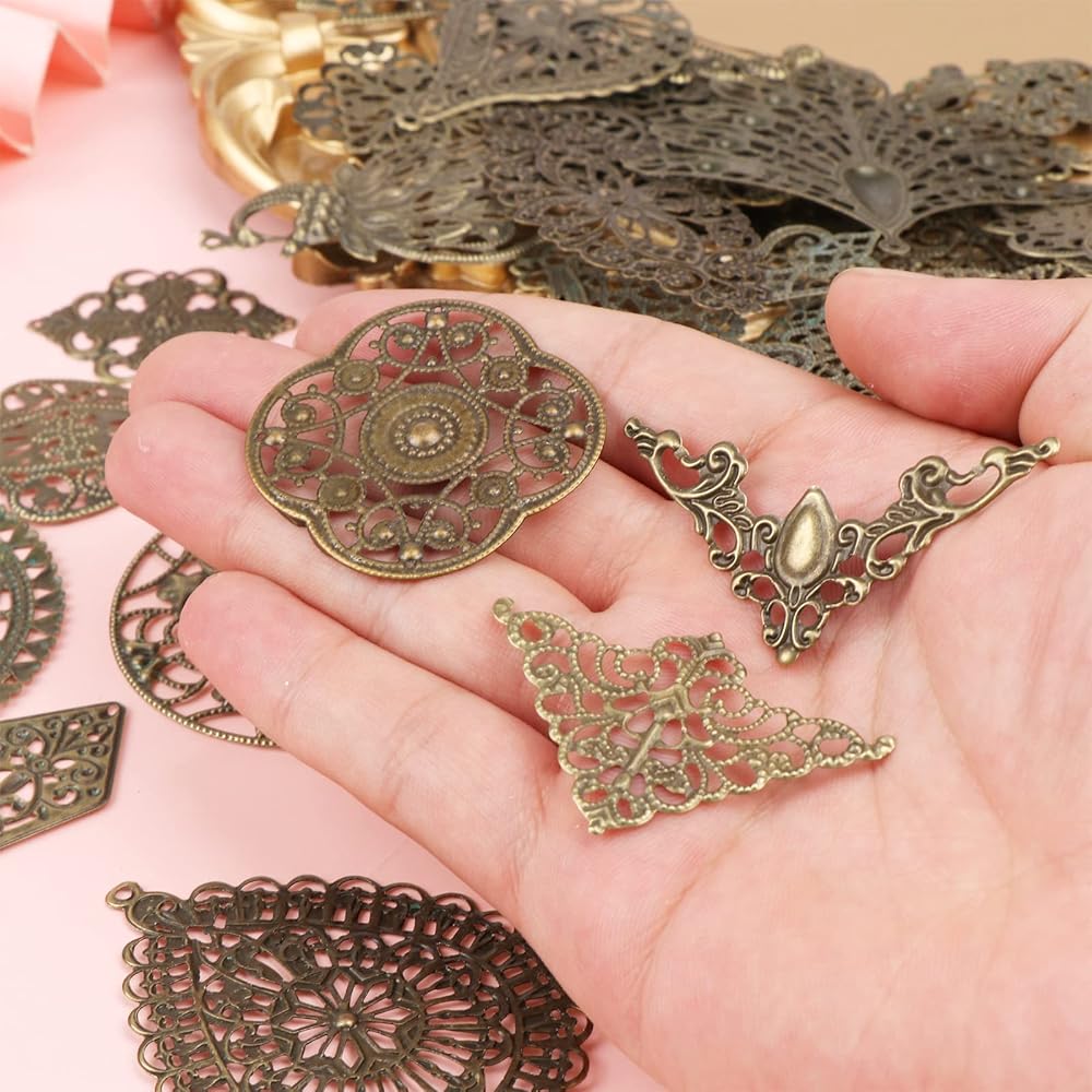 مجموعة متنوعة من الموصلات المخرمة البرونزية - 180 قطعة من مجموعة الصغر البرونزية العتيقة تأتي مع تشكيلة لطيفة من المثلث، دائري مسطح، نجارة تخريمية، زهرة، معين، قلادة، قلادة كبيرة، متدلية، بيضاوية، أجنحة، طائر الفينيق، أوراق الشجر، وما إلى ذلك. القطع برونزية ذات مظهر عتيق ومصنوعة بشكل جيد. لا توجد حواف حادة.
