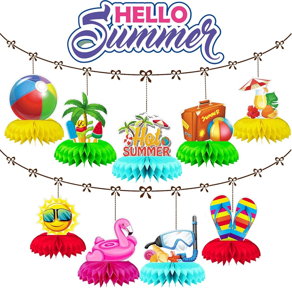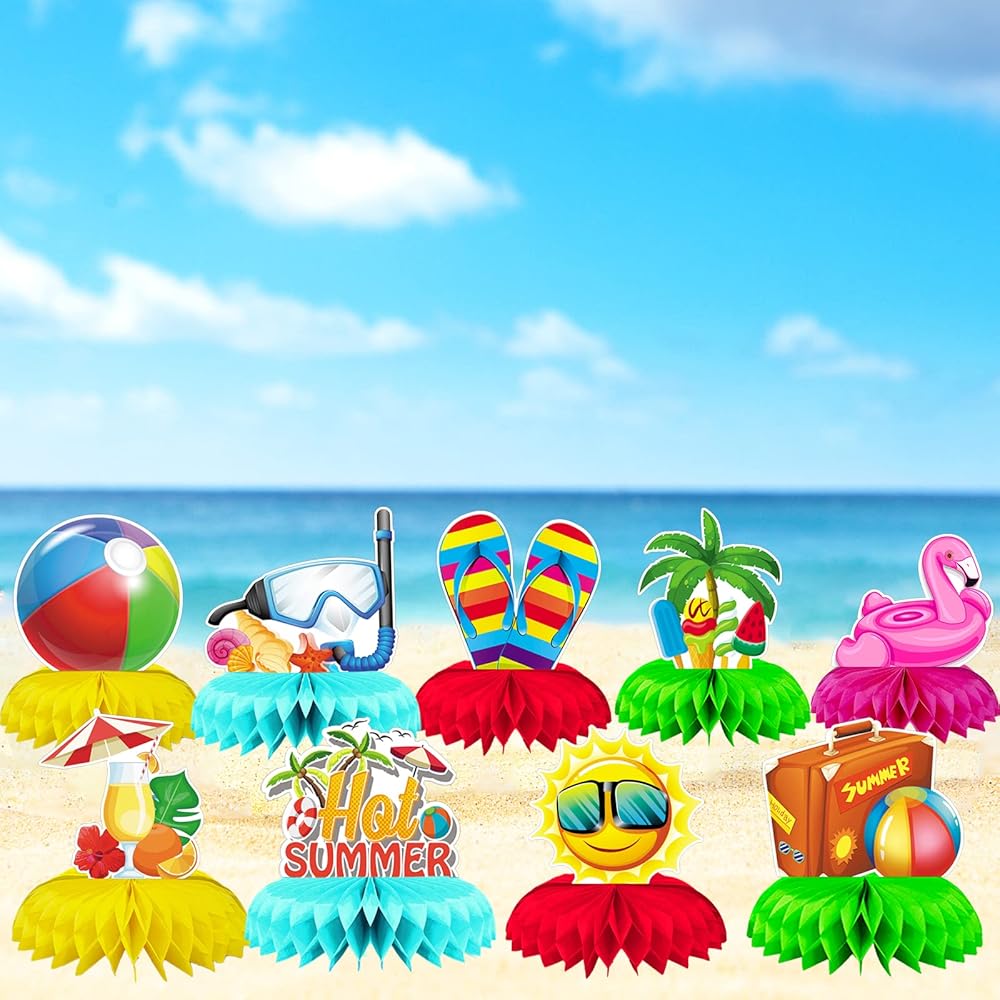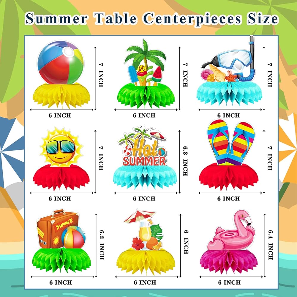 Great Summer Party Decoration - 9 Summer Honeycomb Centerpieces in 9 Different Patterns. Each pattern is carefully designed and printed on both sides. Summer Honeycomb Centerpieces are perfect for summer beach or pool parties. Add a super vibe to your party through these table centerpieces.