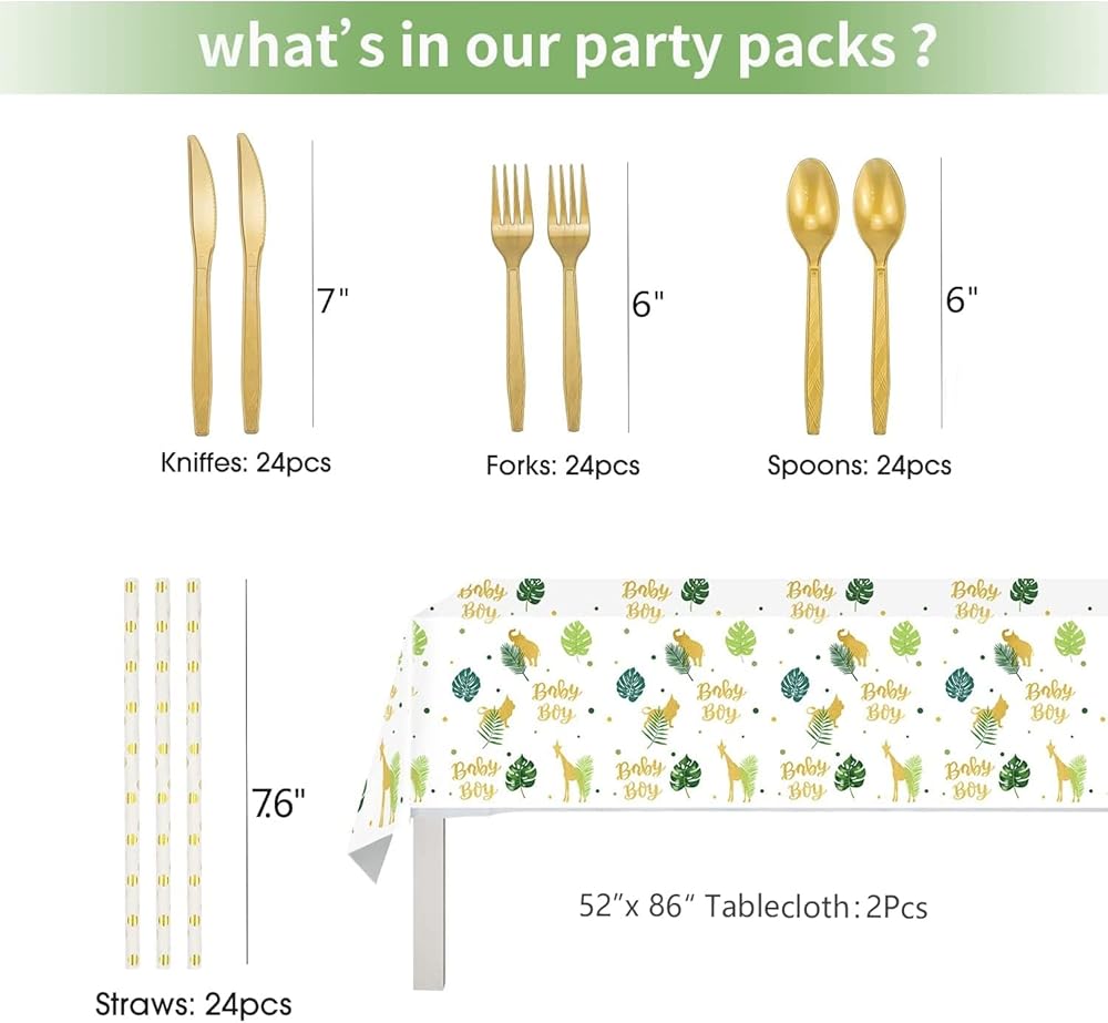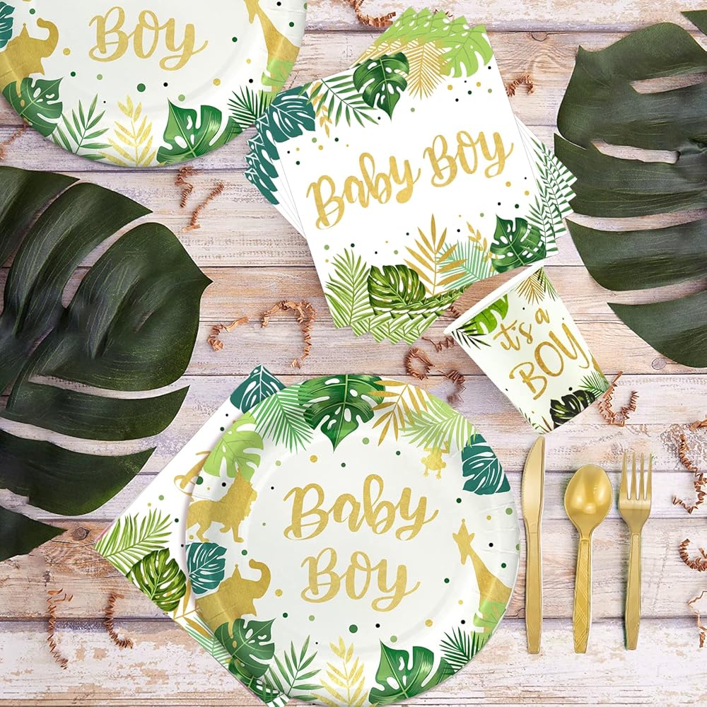 💗【 It's a Boy Decorations for Baby Shower】Our jungle theme baby shower decor product includes 24set cutlery kit, 24pcs 9'' baby boy plates, 24pcs 7'' baby boy plates, 24pcs napkins, 24pcs cups, 24pcs straws, 2pcs safari theme tablecloths for jungle safari theme party decorations