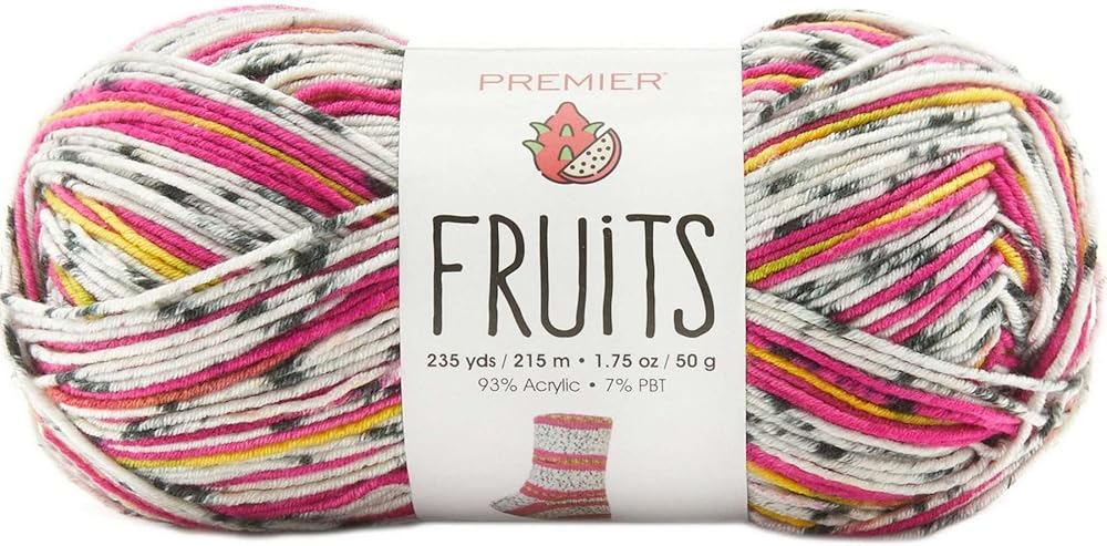 No wool? No problem! Fruits is a self-patterning acrylic-based sock yarn plied with a strand of strengthening PBT which helps make your socks last. With bright colors and fun to knit striping fruit prints; this soft to the touch yarn will add a little spring to your step! Weight Category: #1. Content: 93% Acrylic, 7% PBT. Put up: 1.75oz/50g, 235yds/215m. Gauge: 32sx42r=4in/10cm on size US 2/2.75mm knitting needles. Suggested crochet hook size: US E4/3.5mm. Dyelotted: we try but are not always able to match dyelots. Machine Wash, Do Not Bleach, Tumble Dry, Do Not Iron. Imported. #premieryarns