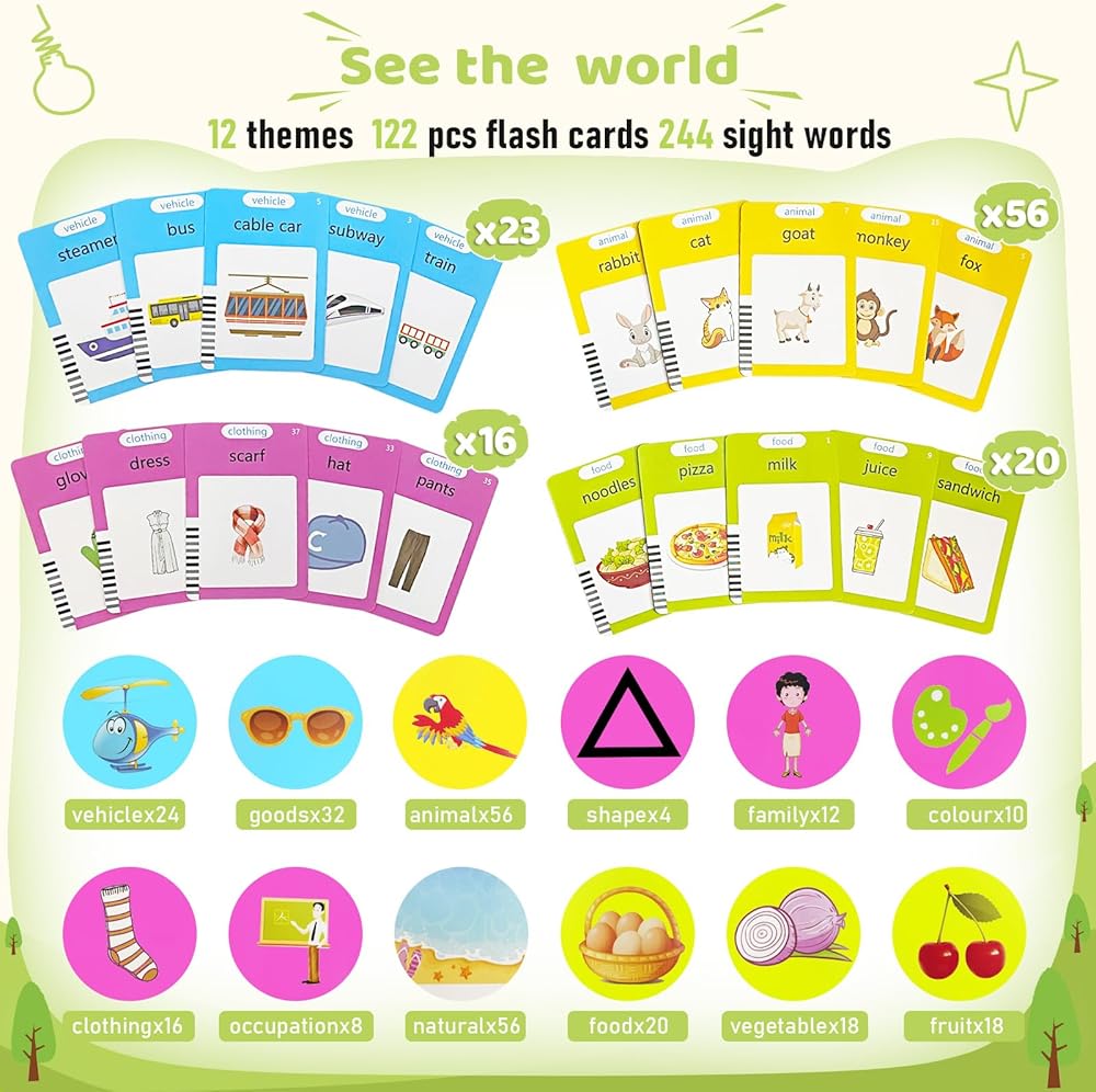 ✨【ألعاب تعليمية للأطفال الصغار】تحتوي اللعبة التعليمية لبطاقة الفلاش الناطقة على 224 كلمة بصرية تغطي 12 موضوعًا مثل الأشكال ووسائل النقل والطعام والفواكه والخضروات والألوان والأزياء والضروريات اليومية والطبيعة والحيوانات والأشخاص والوظائف. لعبة تعليمية رائعة للأطفال من سن 2 إلى 4 سنوات فما فوق لتعلم الكلمات البصرية وتعزيز القدرة الإدراكية وبناء المفردات.