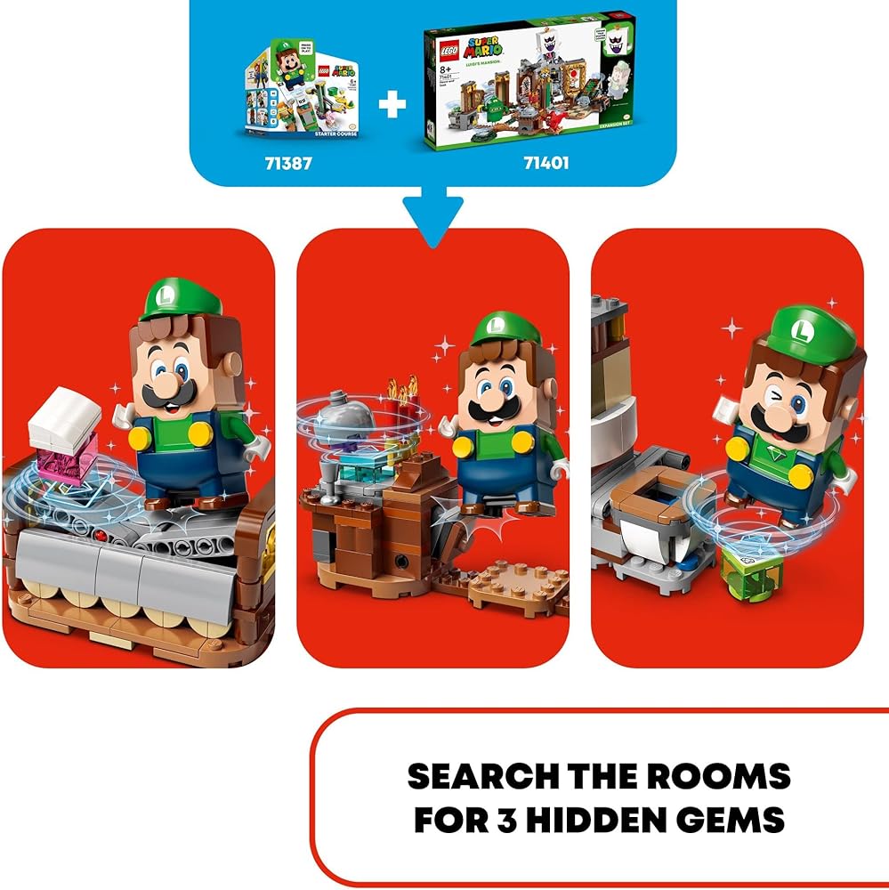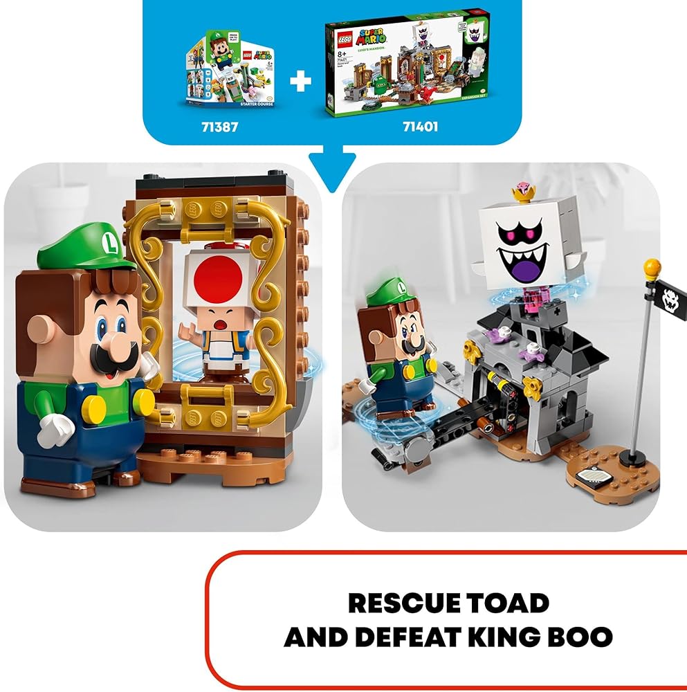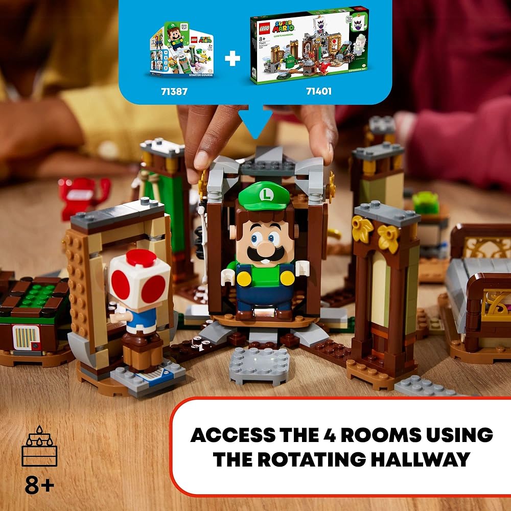 Create a gem-hunting, ghost-battling LEGO Super Mario level with Luigi's Mansion Haunt-and-Seek Expansion Set (71401) for ages 8 and up. It features a new-for-January 2022 start plate and a rotating hallway to access each room. There are lots of fun challenges for LEGO Luigi or LEGO Mario (figures are not included): rescue Toad from a painting, uncover hidden gems, battle a haunted pool table, defeat a Garbage Can Ghost and a Grabbing Ghost, and topple King Boo from the tower. (Note: The71387 or 71360 Starter Course is required for interactive play.) This collectible toy playset makes a super gift for trendsetting kids. Check out the LEGO Super Mario app for building instructions, creative ideas and more. Collectible Luigi's Mansion sets offer spooky adventures with LEGO Luigi as the hero. The puzzle-solving play is even more thrilling when family members play as a team and level up with the Poltergust (sold separately in set 71397) to defeat ghosts.