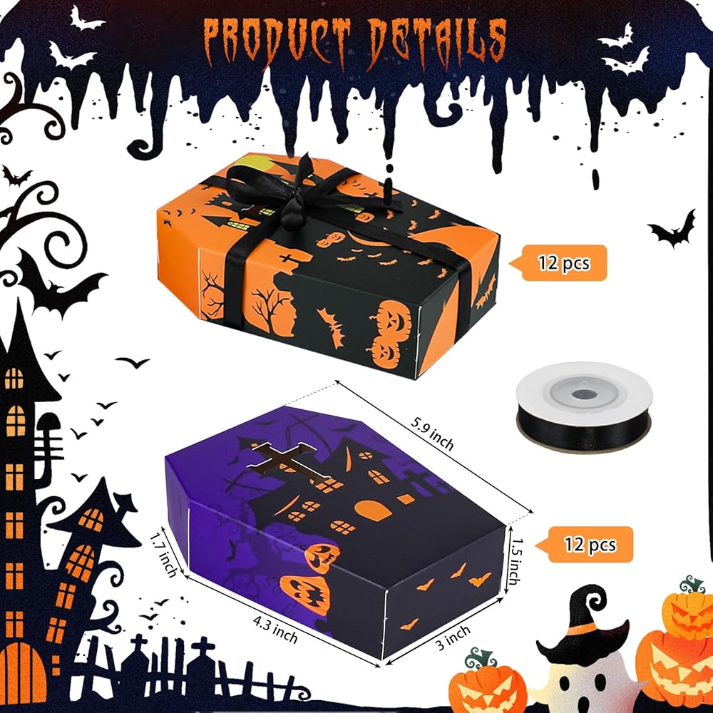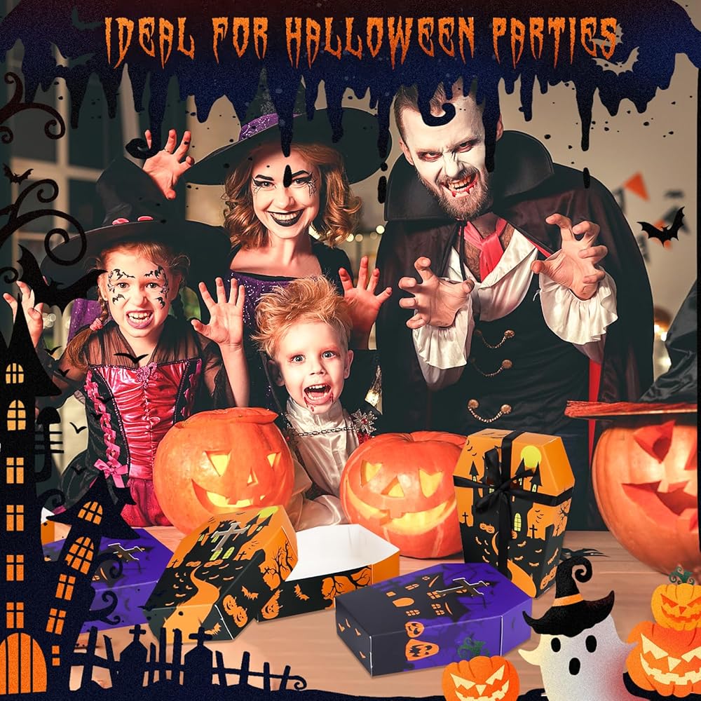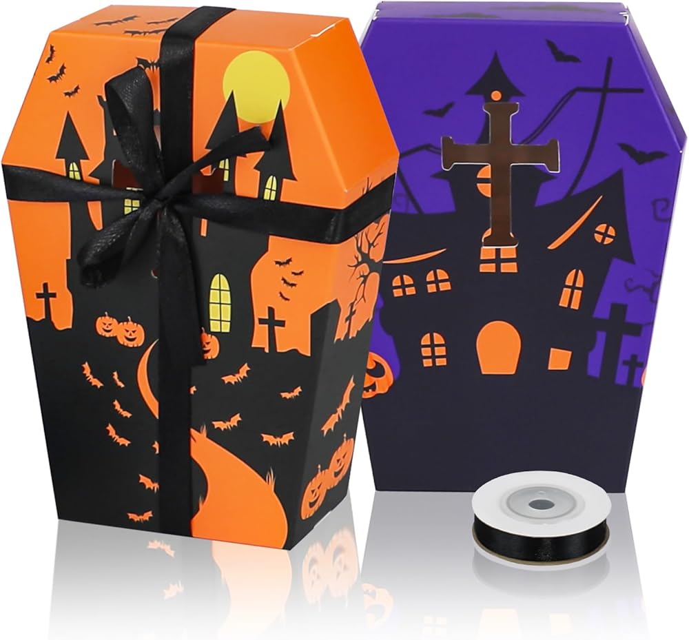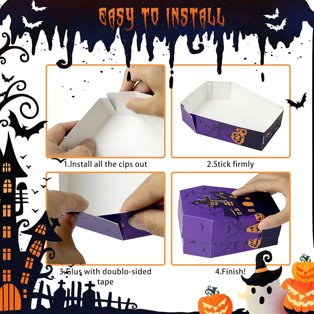 لوازم حفلات الهالوين: صواني تابوت الهالوين صغيرة الحجم وخفيفة الوزن، والتي يمكن أن تحتوي على مجموعة متنوعة من الوجبات الخفيفة لحفلات الهالوين مثل حلوى الكوكيز والشوكولاتة وأكثر من ذلك