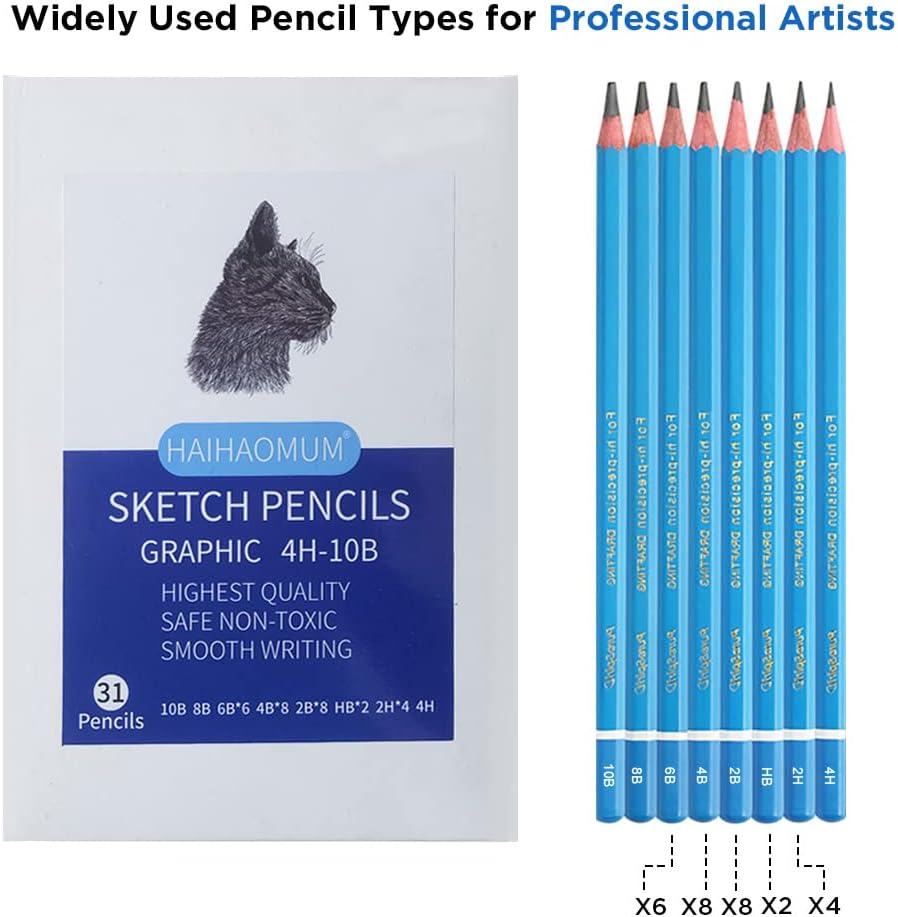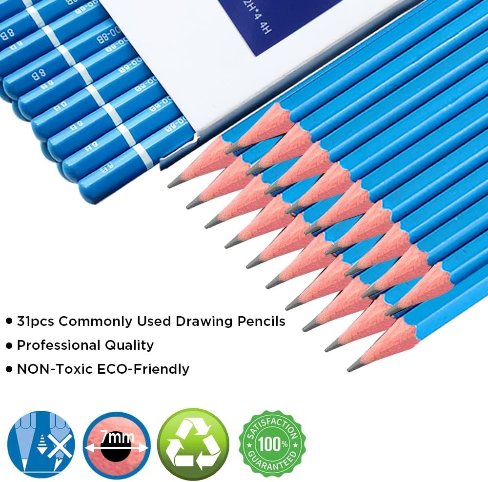 • 31 قلم رصاص غرافيت للرسم الفني (4H، 2H*4، HB*2، 2B*8، 4B*8، 6B*6، 8B، 10B)