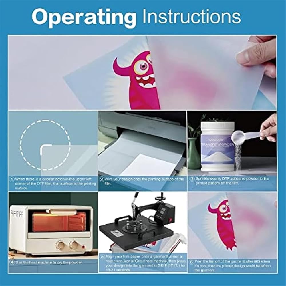 سهل الاستخدام: فقط ضع غشاء دي تي اف في طابعة دي تي اف وفقًا لذلك. اقلب جانب الطلاء لأعلى. لا حاجة لإزالة الأعشاب الضارة، يمكنك إنشاء وقص وطباعة أي حجم وصورة تريدها