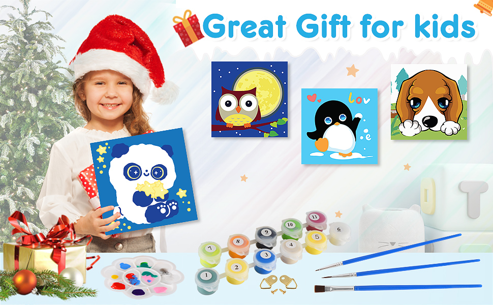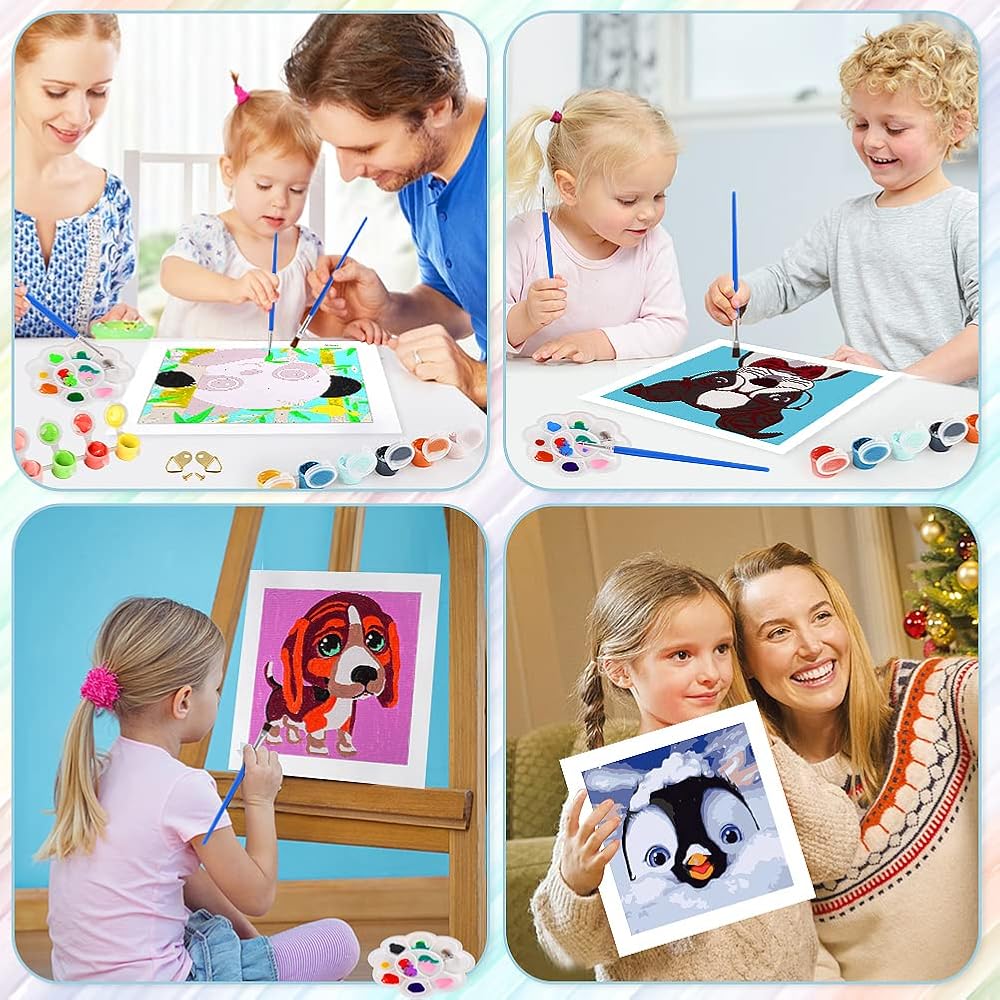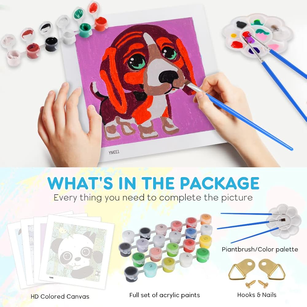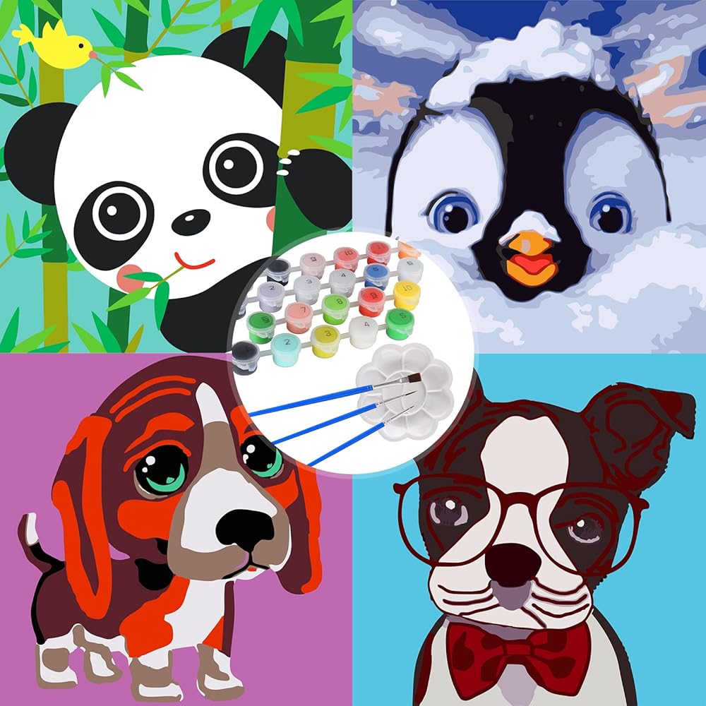 🎨【محتويات العبوة】تأتي مع 4 أنماط حيوانات لطيفة، كل منها يتضمن 4 قطع من القماش، و4 مجموعات من فرش الرسم (3 فرش مختلفة الحجم للمناطق الكبيرة والصغيرة وللخطوط)، ولوحة لمزج الألوان من أجل الإبداع، ومع بعض البراغي المعدنية للتعليق (بدون إطار بما في ذلك)