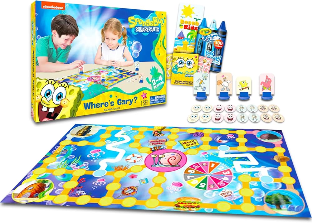 • مرخص رسميًا من سبونج بوب أين غاري؟ لعبة لوحية مثالية لمحبي سبونج بوب من جميع الأعمار، الأولاد والبنات على حد سواء. تتضمن المجموعة أيضًا ملصقات سبونج بوب وملصقات مكافآت كرايولا الزرقاء وعلاقة باب بيتش كيدز.