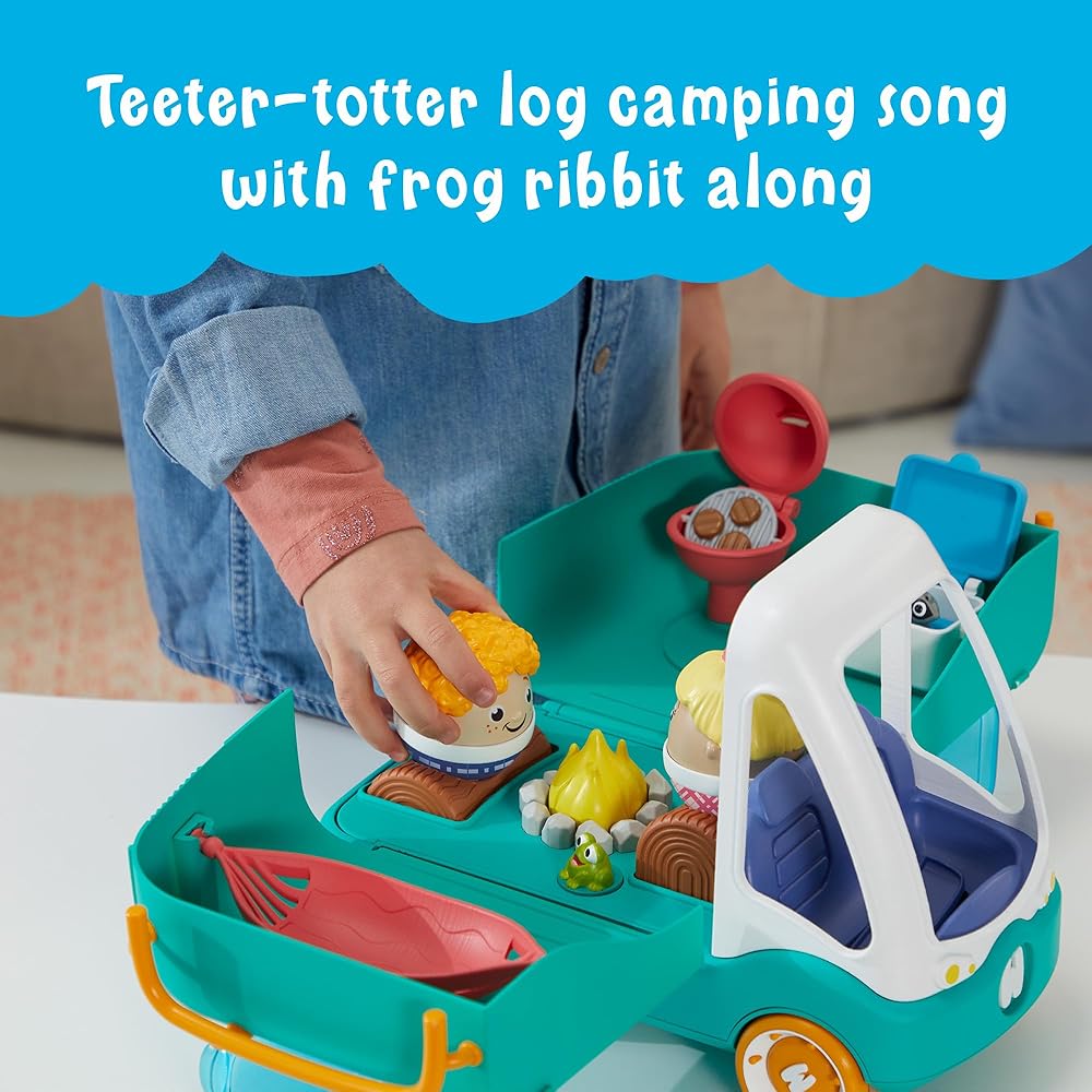 Pile in—let's go camping! Little ones can "drive" the camper with Bailey and Alex in the sliding seat, and cruise around looking for the perfect camping spot! When they open up the camper, they'll find all the camping fun packed inside! Bailey and Alex teeter totter by the flickering campfire lights and sing their favorite camping song—and a frog ribbits along! Your child can also play with them in the hammock or by the flip-over grill and cooler—Surprise!—there's a friend inside waiting to say hello! My Happy Camper is packed full of fun surprises, and comes with the unfolding camp site van, Weebles Bailey and Alex, and instructions. Batteries not included.