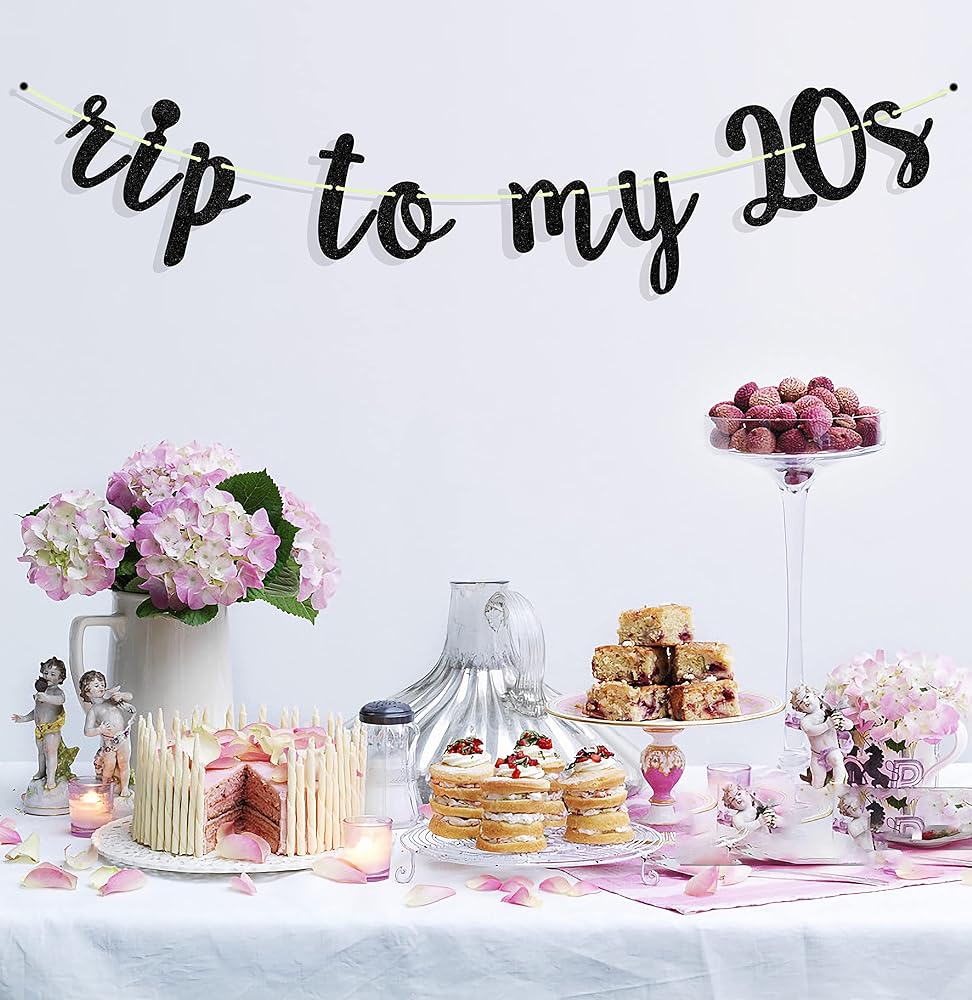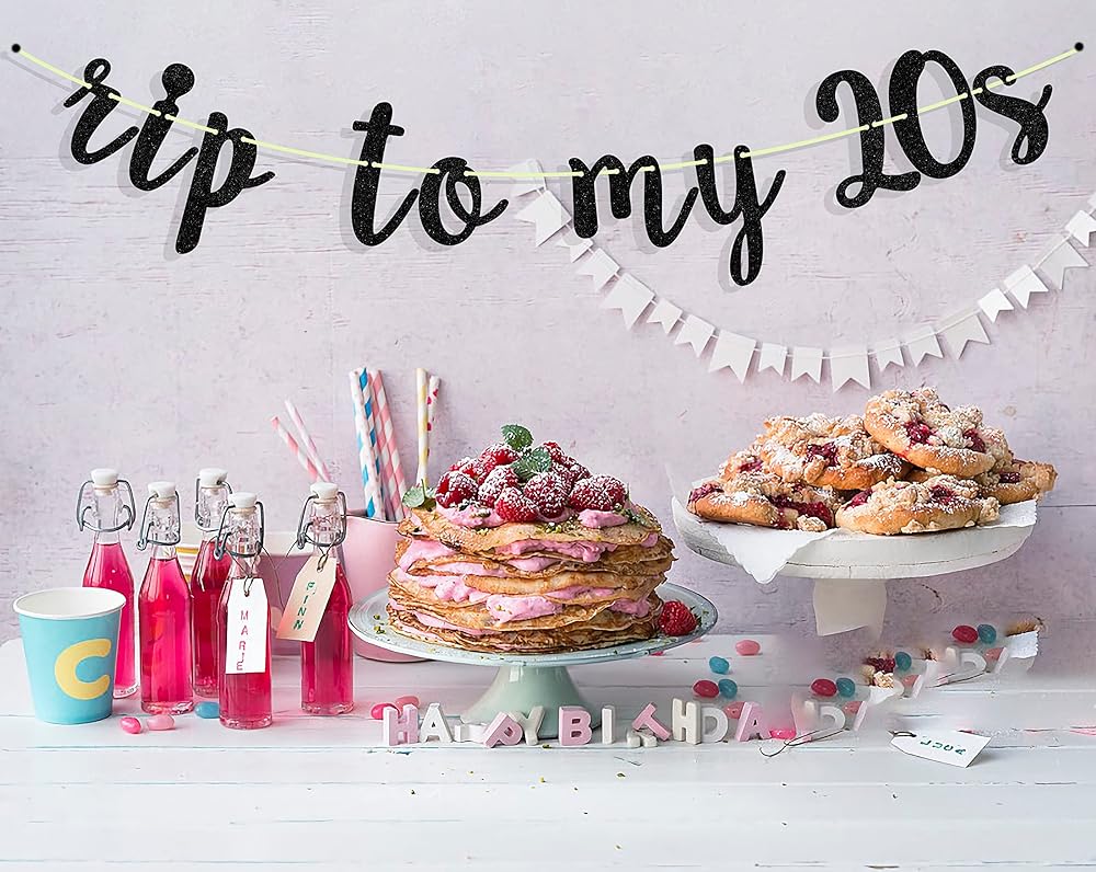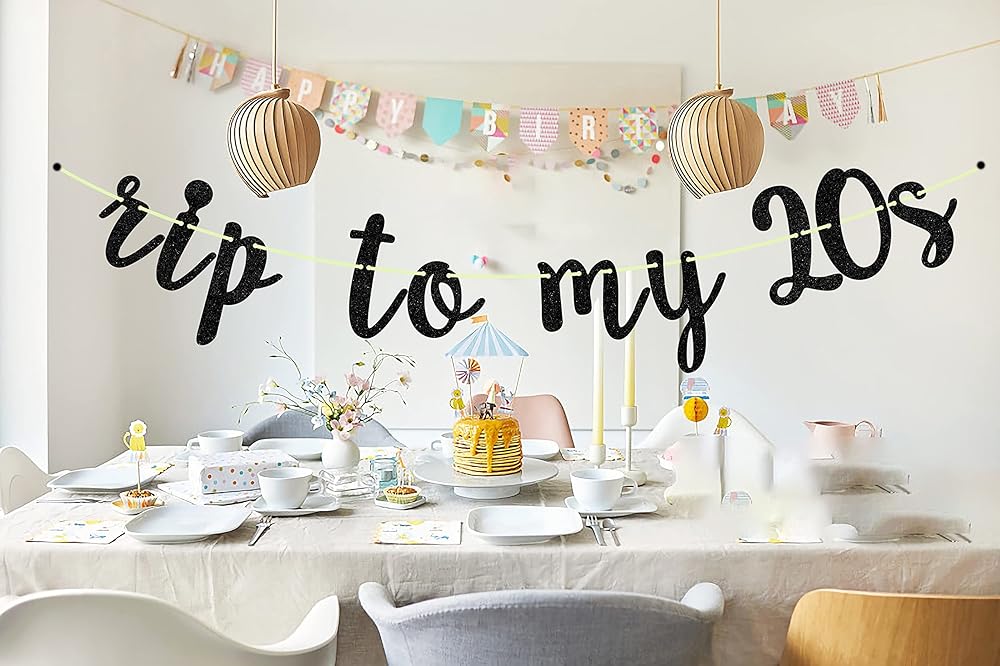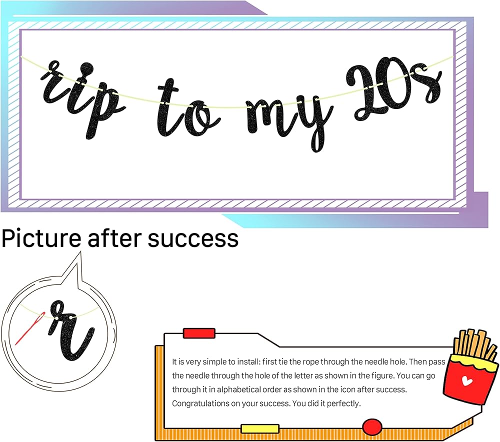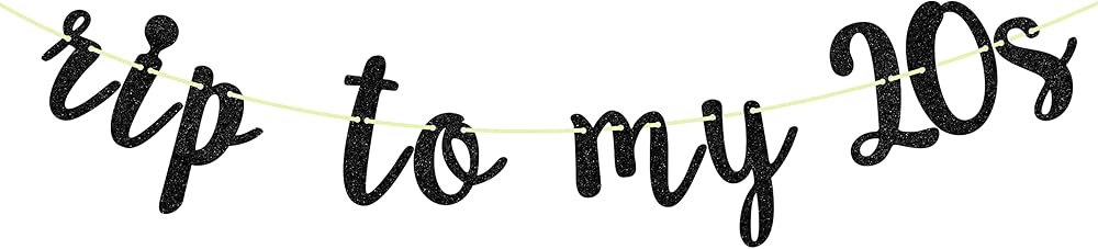 Content: 1Pcs Rip to My 20s Banner ,Glittery material adds a high-end feel to the party.Note: After receiving the product, Letters cardstock and ribbon come separately, you need to connect the banner by yourself.