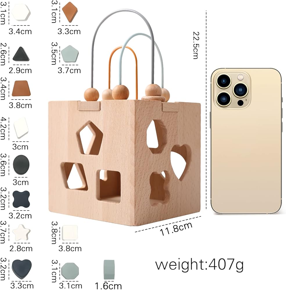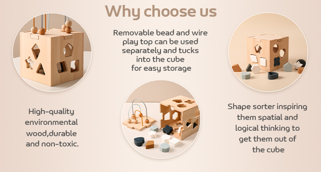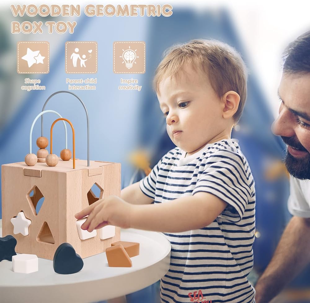 Wooden Activity Cube:Includes 2 Activity To Play Which Is Baby Blocks Shape Sorter Toy With different color shapes, And A Removable Wire Bead Maze On The Top.