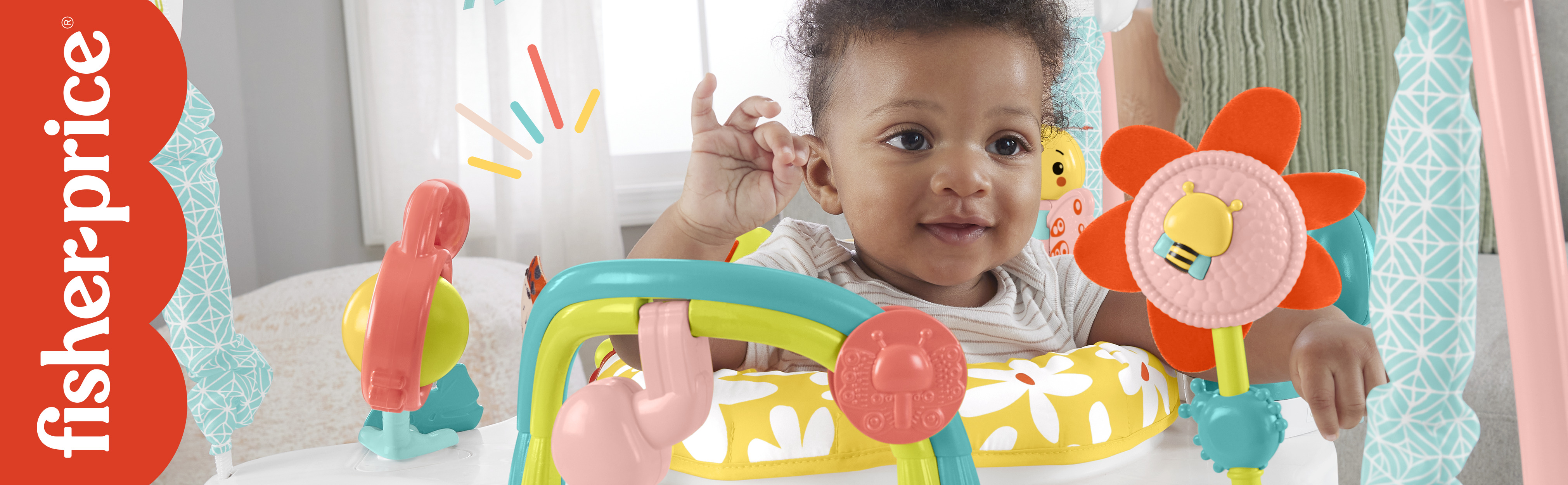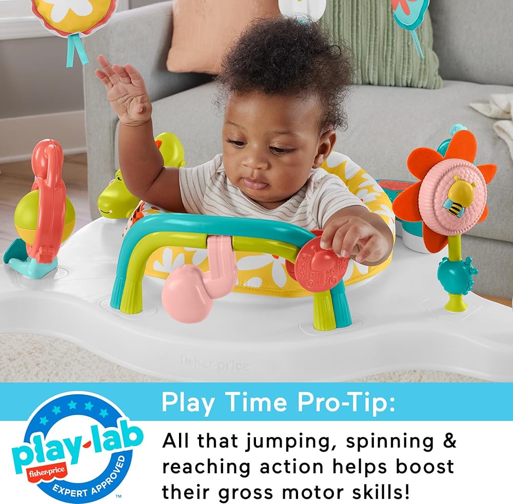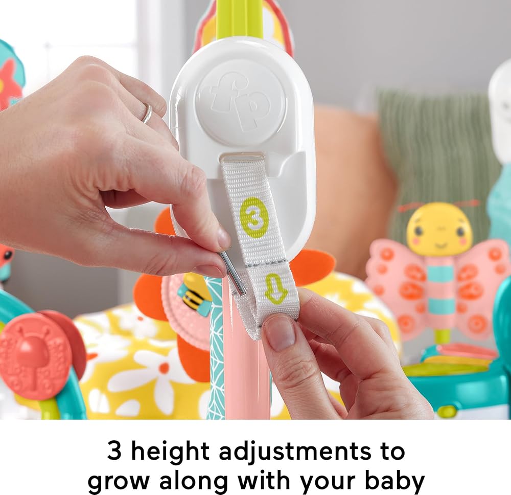 Baby can spring into fresh sensory fun with the Fisher-Price Blooming Fun Jumperoo activity center. Every jump activates fun lights, music and sounds, encouraging your little one to keep bouncing and strengthening those gross motor skills. This freestanding jumper has a spinning seat and a variety of hands-on activities all around for your baby to explore, plus three height adjustments to grow along with your baby. Max. weight 25 lb/ 11,3 kg. Use only for a child who is able to hold head upright unassisted and who is not able to walk or climb out of product.