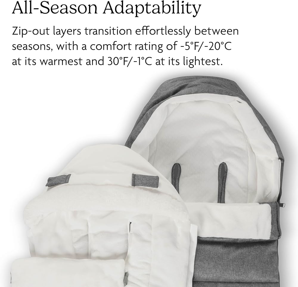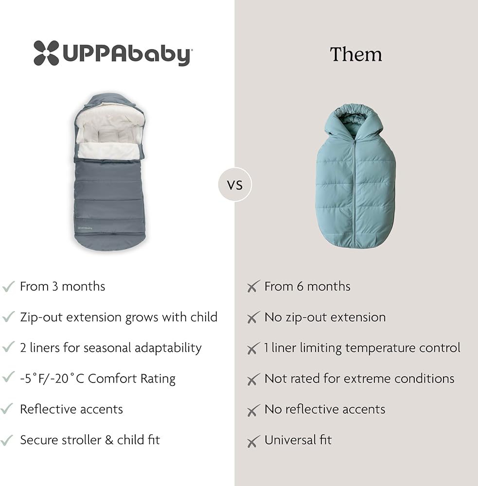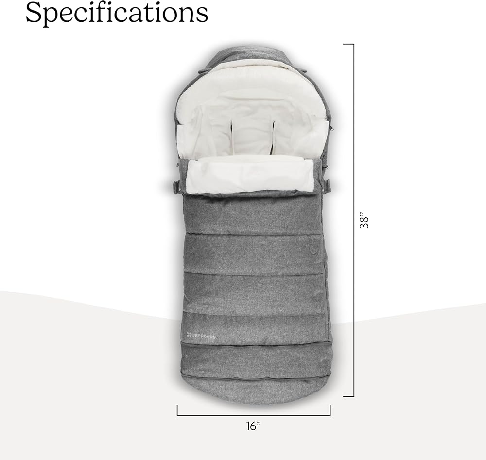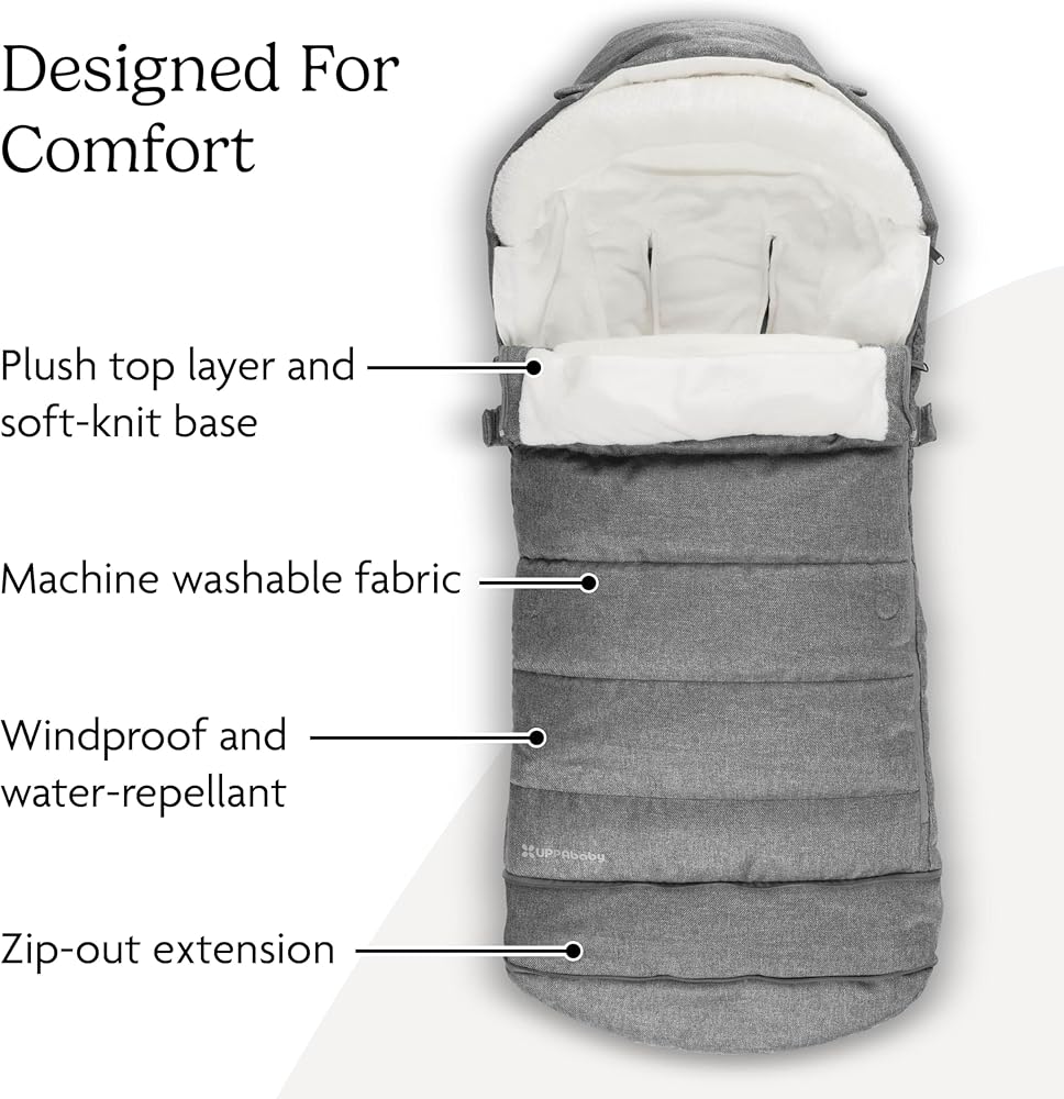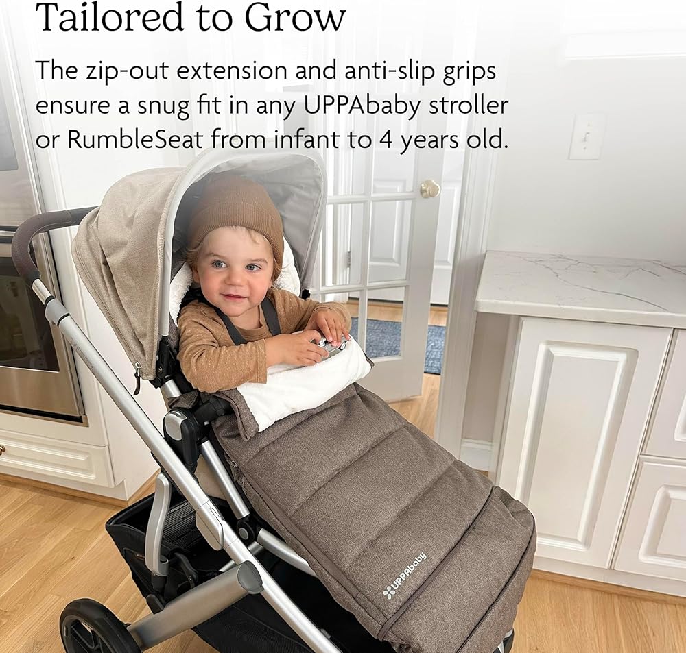 Optimized for all UPPAbaby strollers and RumbleSeats, the ultra-plush CozyGanoosh footmuff provides ultimate coverage to keep your child toasty warm in inclement weather. New softer and cozier fleece lining Grows With Child using zip out extension and adjustable hood RumbleSeat Compatible with zipped in size Increased hood coverage rolls over seat when not in use Stays in Place with grips to prevent sliding Quick and easy attachment to the seat harness Comfort rating of -5 degrees Fahrenheit / -20 degrees Celsius Compatible with All UPPAbaby Strollers and RumbleSeats Windproof and water-repellent material protects child from cold weather conditions