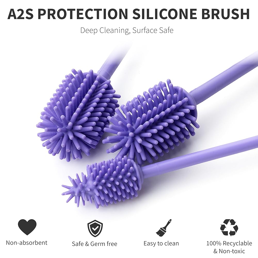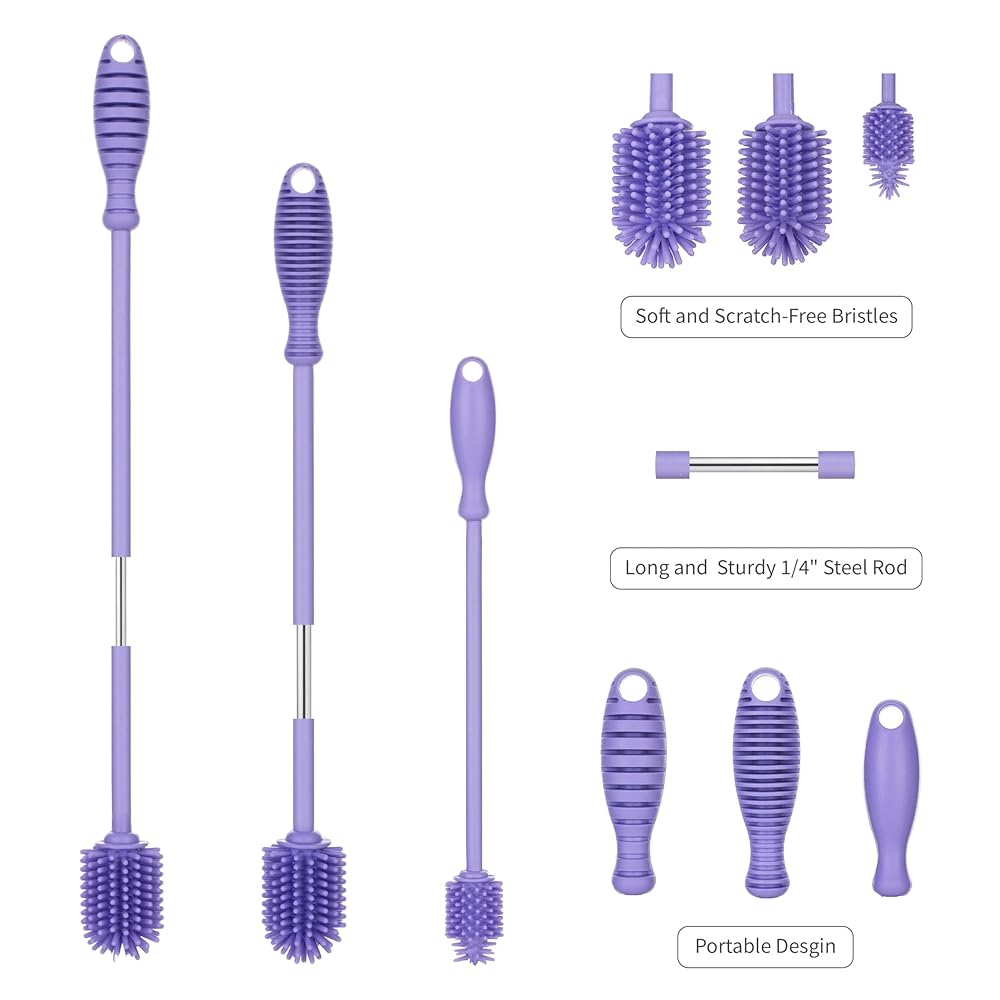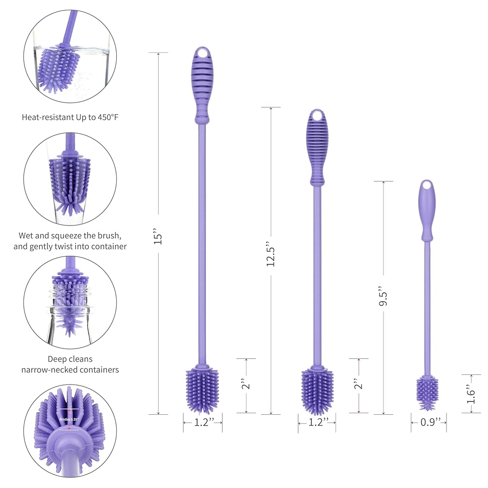 تنظيف آمن - فرش السيليكون الآمنة غذائيًا والخالية من مادة BPA بنسبة 100% لتنظيف الزجاجات ذات الرقبة الضيقة والنظارات والبلاستيك آمنة للتنظيف الساخن (حتى 140 درجة فهرنهايت). يمكن غسل الفرشاة A في غسالة الأطباق أو بالماء المغلي. خفيفة الوزن وآمنة للاستخدام في الميكروويف، توفر غسالات الزجاجات المتميزة لدينا تنظيفًا متسقًا وعالي الجودة. نحن شركة مقرها الولايات المتحدة ونقدم خدمة عملاء متميزة، إذا كانت لديك أي أسئلة أو مشكلات، يرجى مراسلتنا وسوف يقوم أحد أعضاء فريقنا بالرد عليك على الفور