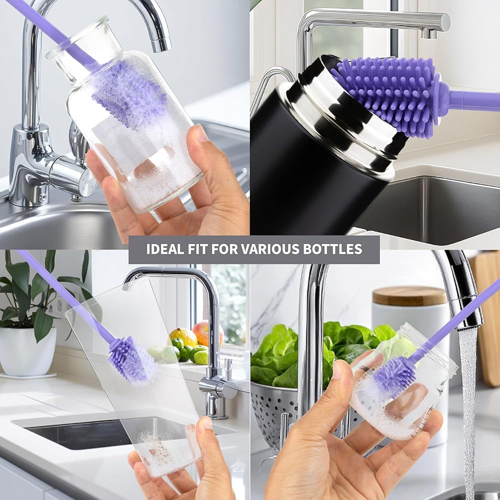 بديل صحي - أكثر صحية من استخدام الإسفنجة، فرشاة الزجاجات المصنوعة من السيليكون غير الماصة لتنظيف الزجاجات الطويلة والصغيرة تمنع الأوساخ من التجمع على سطحها، مما يجعلها سهلة التنظيف والحفاظ على صحتها. فرشاة التنظيف هذه ذات المقبض الطويل هي فرشاة تنظيف منزلية متعددة الاستخدامات لتنظيف الزوايا أو الأخاديد حيث لم يتم استخدام أي فرشاة أخرى لغسل الأطباق من قبل. فرشاة محمولة لتنظيف زجاجات الأطفال، ومنظف أكواب آمن للغسل في غسالة الأطباق، وفرشاة سفر يمكنك الاعتماد عليها