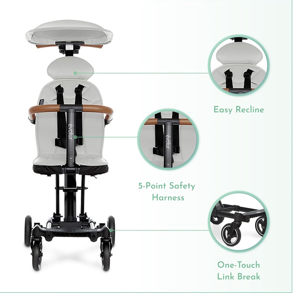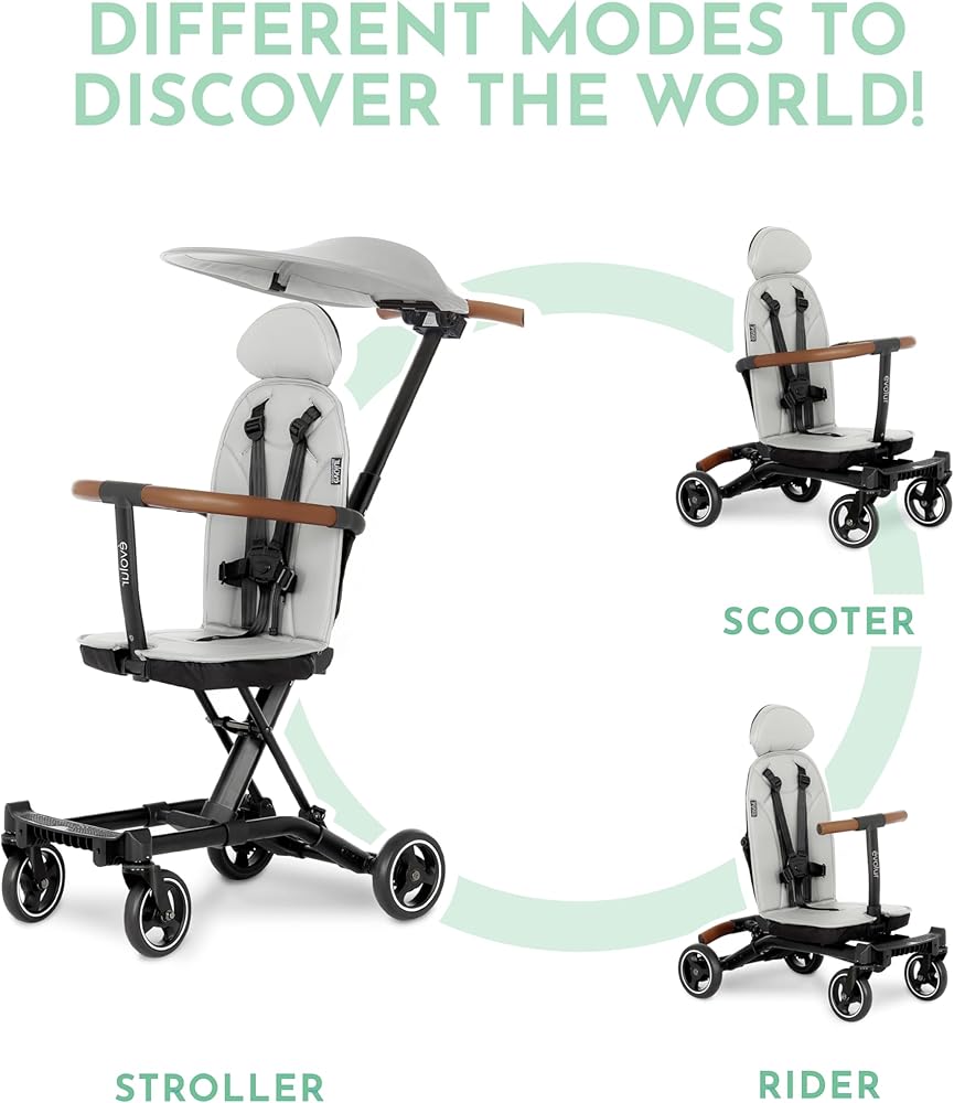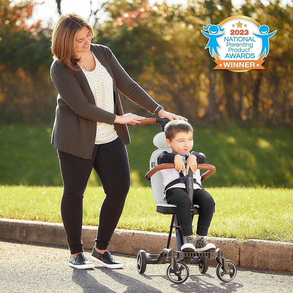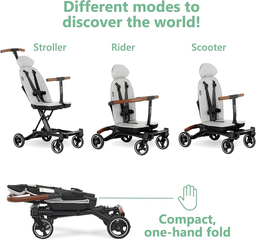 Let your little one discover the world from the lap of luxury aboard the Evolur Cruise Rider Stroller with Canopy! A proud winner of the 2023 NAPPA Awards, this one-of-a-kind stroller is loaded with features for those afternoon walks, grocery runs & family outings. This compact stroller folds inwards like a book in seconds, easily reclines & can be carried on your shoulder everywhere (Carry Belt included). With a high-density, durable handle & bumper grip (optional closed bumper & T-bar), front wheels with suspension, and a one-touch link brake, the Cruise Rider Stroller with Canopy is crafted for easy maneuverability. By effortlessly converting to a Scooter & Rider, this innovation-driven stroller combines flexibility and functionality. Safety comes first as this stroller comes with a 5-point safety harness and meets/exceeds ASTM, CPSC & Federal Flammability standards. Maximum comfort for your child with a plush seat, padded headrest & extendable backrest for taller babies. The Cruise Rider Stroller with Canopy comes with accessories like the Cruise Rider Twin Connector, Storage Basket, Rain Cover & a fun Scooter front (All sold separately). Easy to maintain by wiping with a damp cloth & air dry.