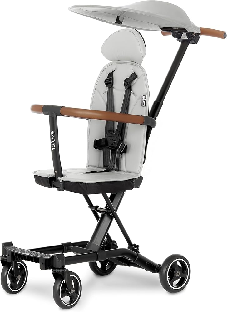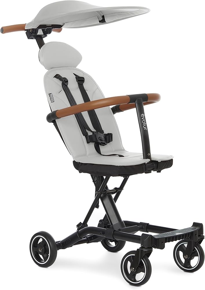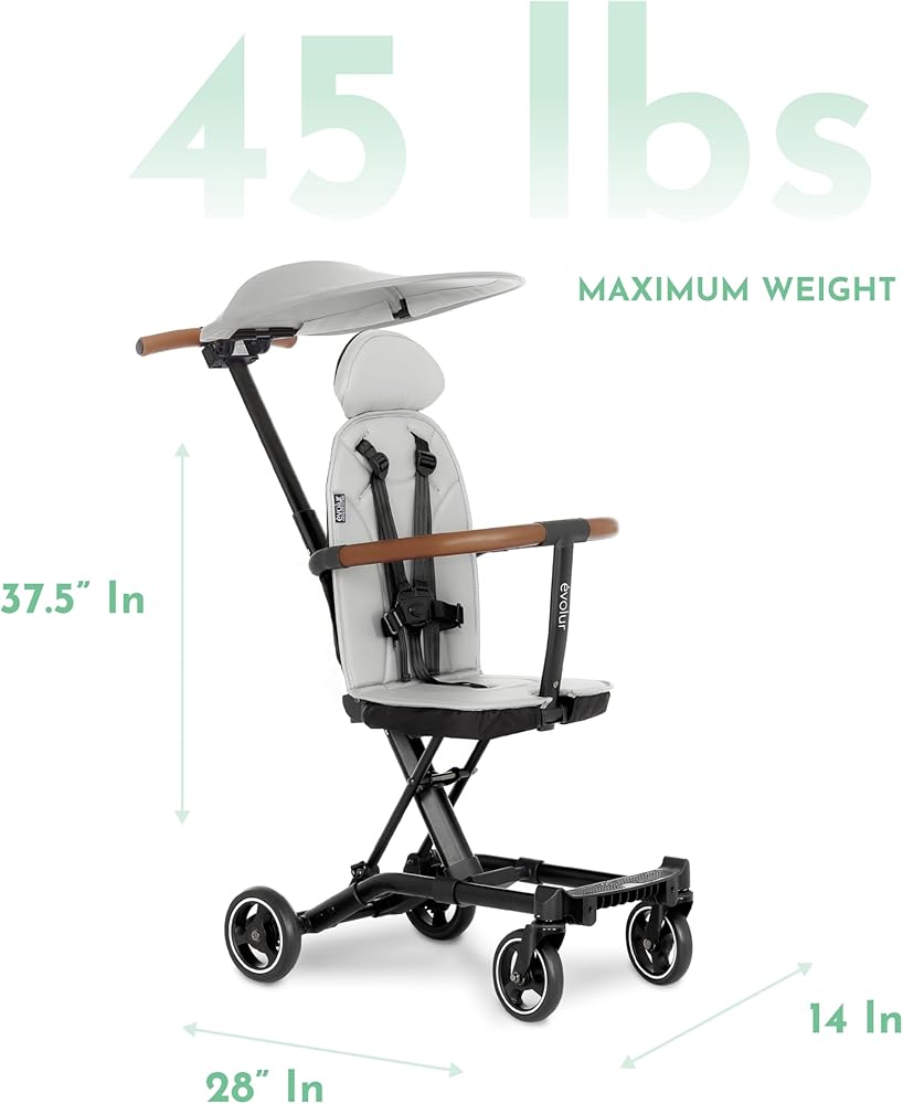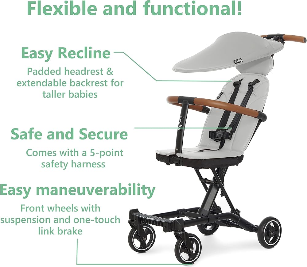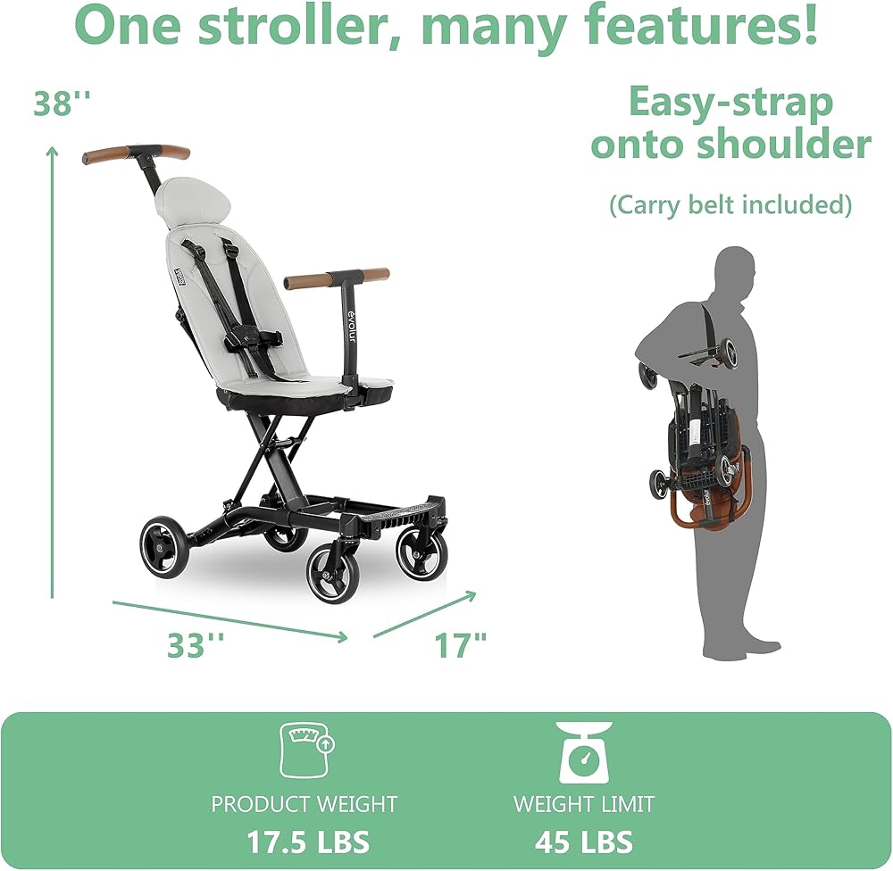 COMPACT & COMFORTABLE: The Evolur Cruise Rider Stroller folds inward like a book in seconds, comes with an easy recline feature & can be carried on your shoulder everywhere (Carry Belt included). Comes with a plush seat cover, padded headrest & extendable backrest for taller babies.