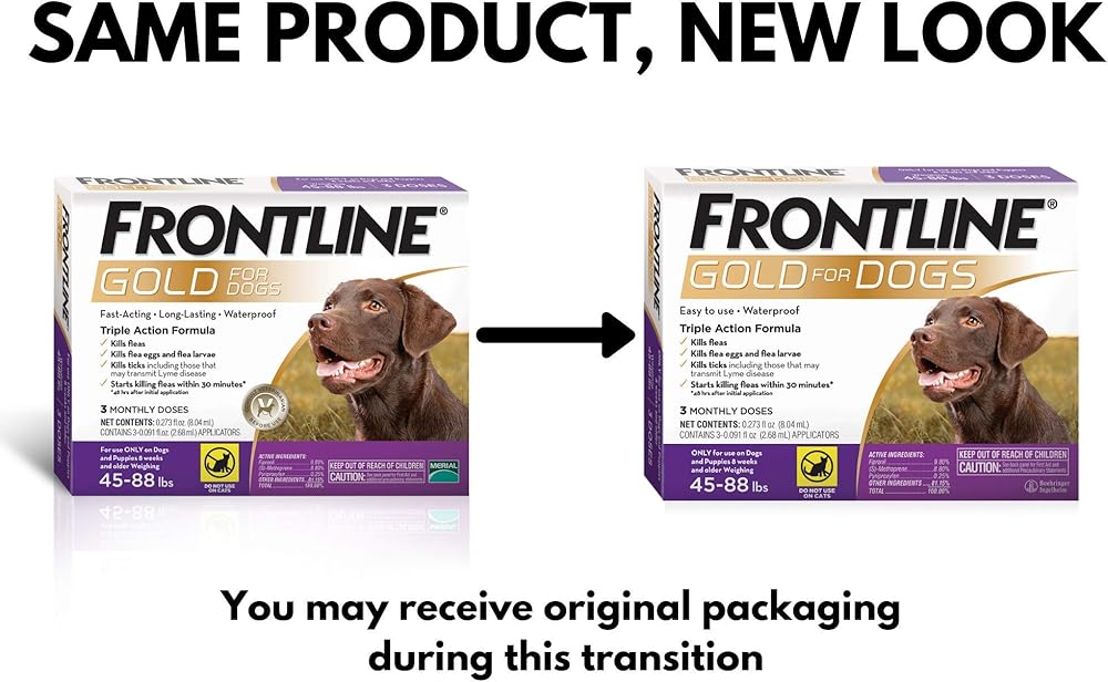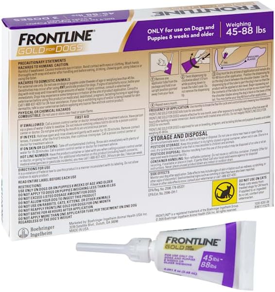 Treat your dog with FRONTLINE® Gold for Dogs. Regular use of FRONTLINE® Gold for Dogs kills adult fleas, flea eggs and larvae, and ticks for a full month. FRONTLINE® Gold for Dogs' three active ingredients, fipronil, (S)-methoprene and pyriproxyfen, work to break the flea life cycle and control and prevent flea infestations. (Reference: *Data on file at Boehringer Ingelheim.)